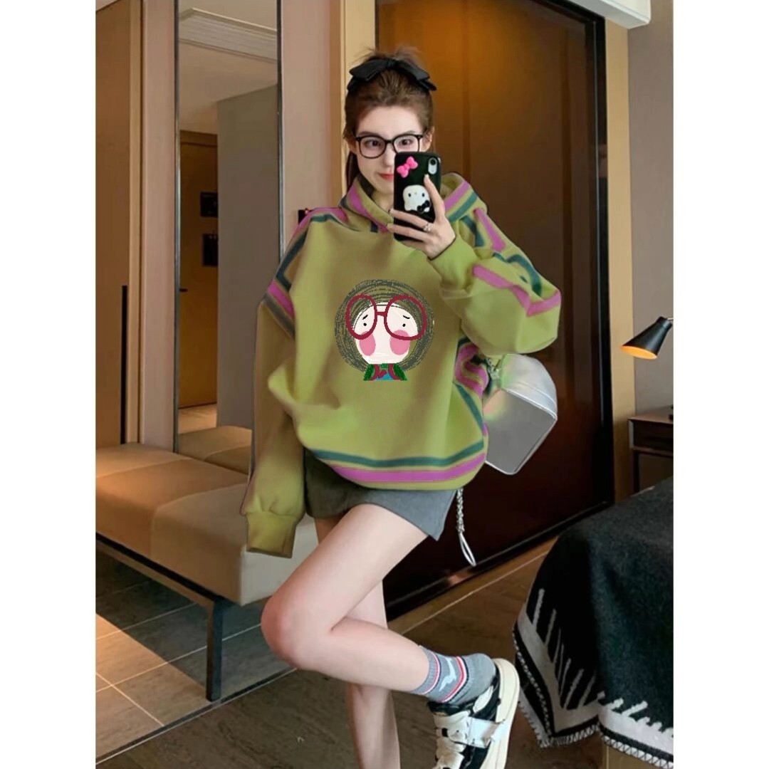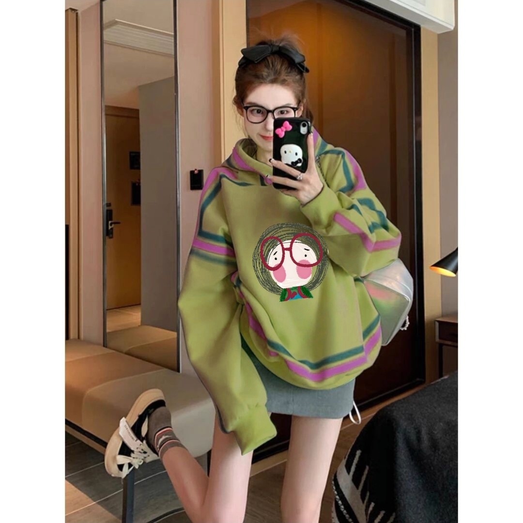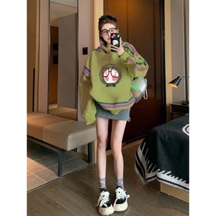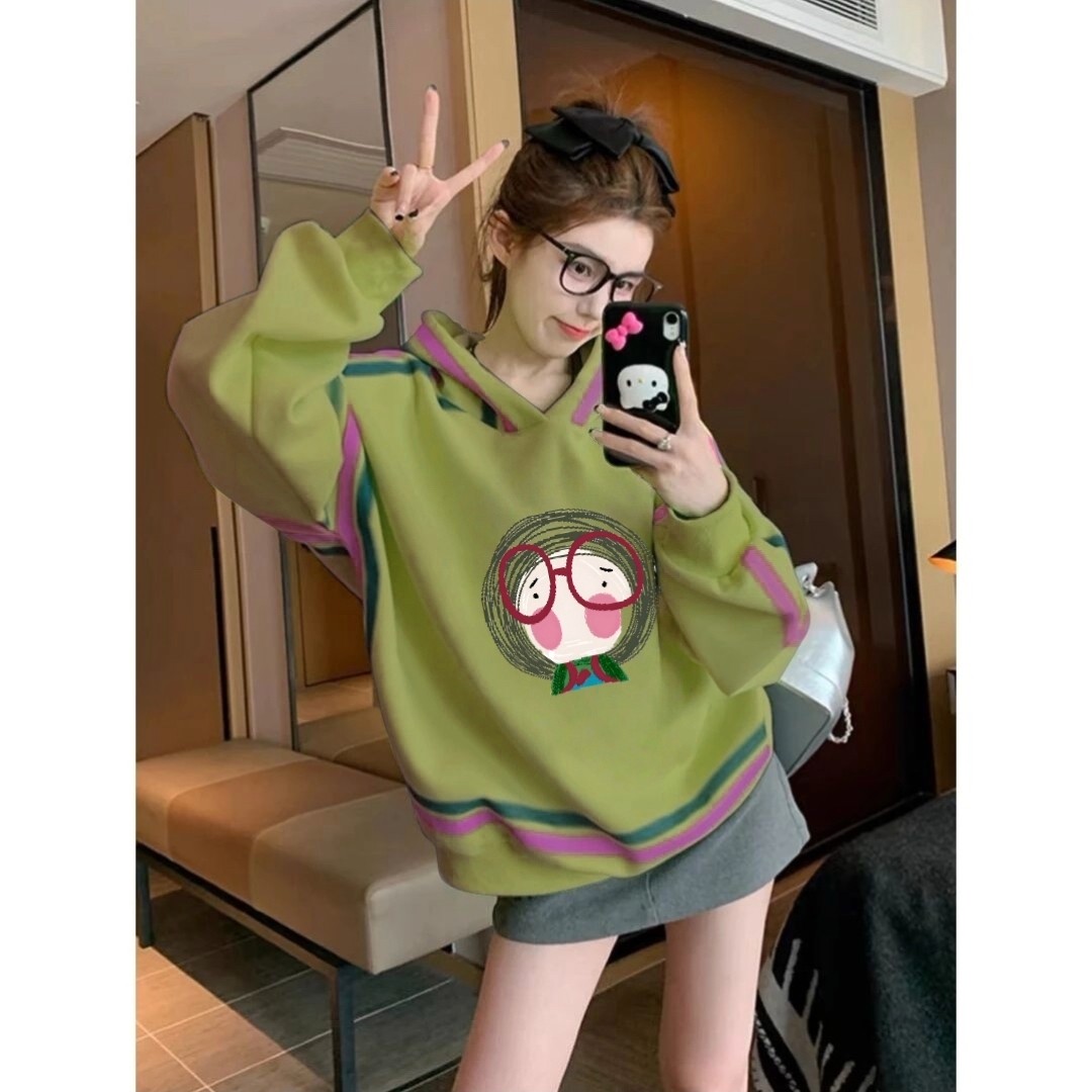 绿色连帽卫衣女2025冬季 洋气百搭卡通印花加绒加厚保暖外套女 新款