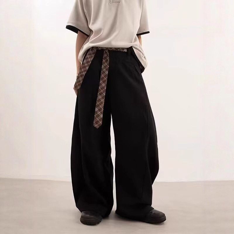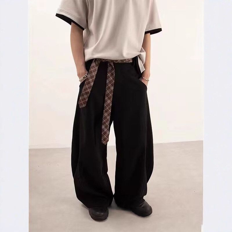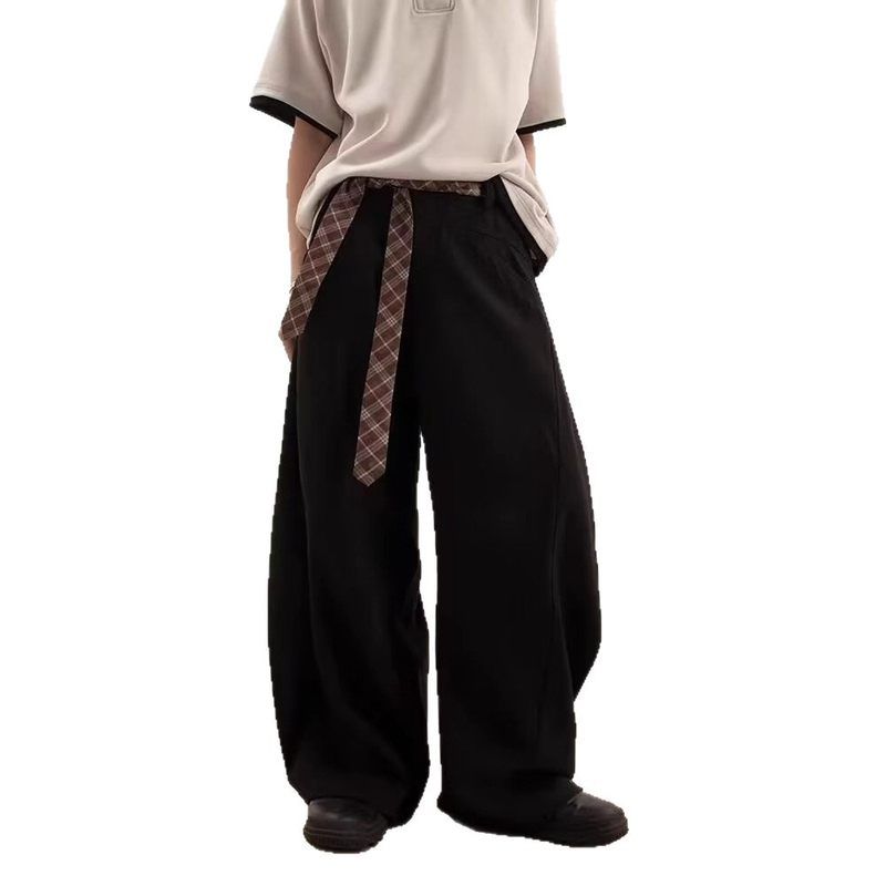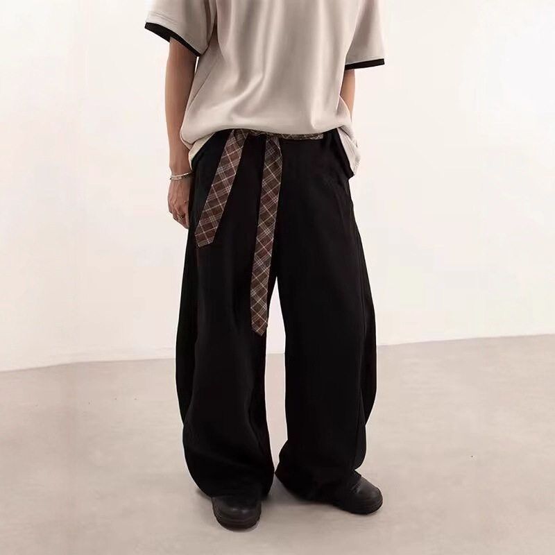夏季 女休闲裤 格子弯刀男显瘦镰刀高腰 腰带阔腿裤 复古宽松美式