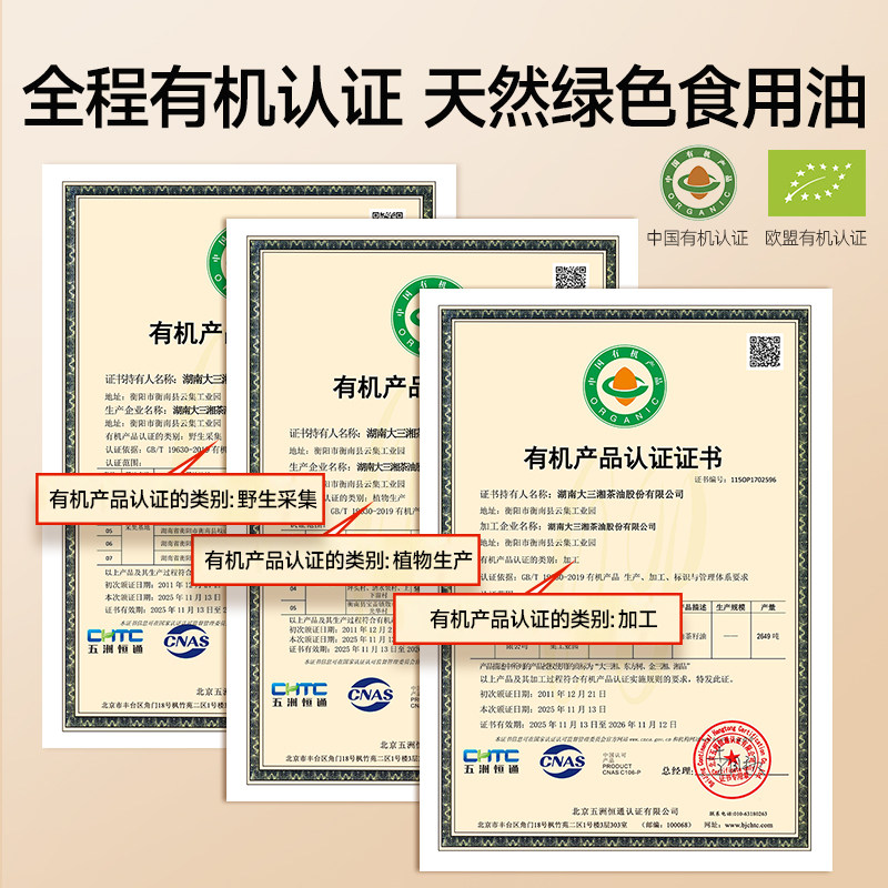 湖南茶油大三湘浓香有机山茶油压榨冷提高端烹饪家庭食用油5L