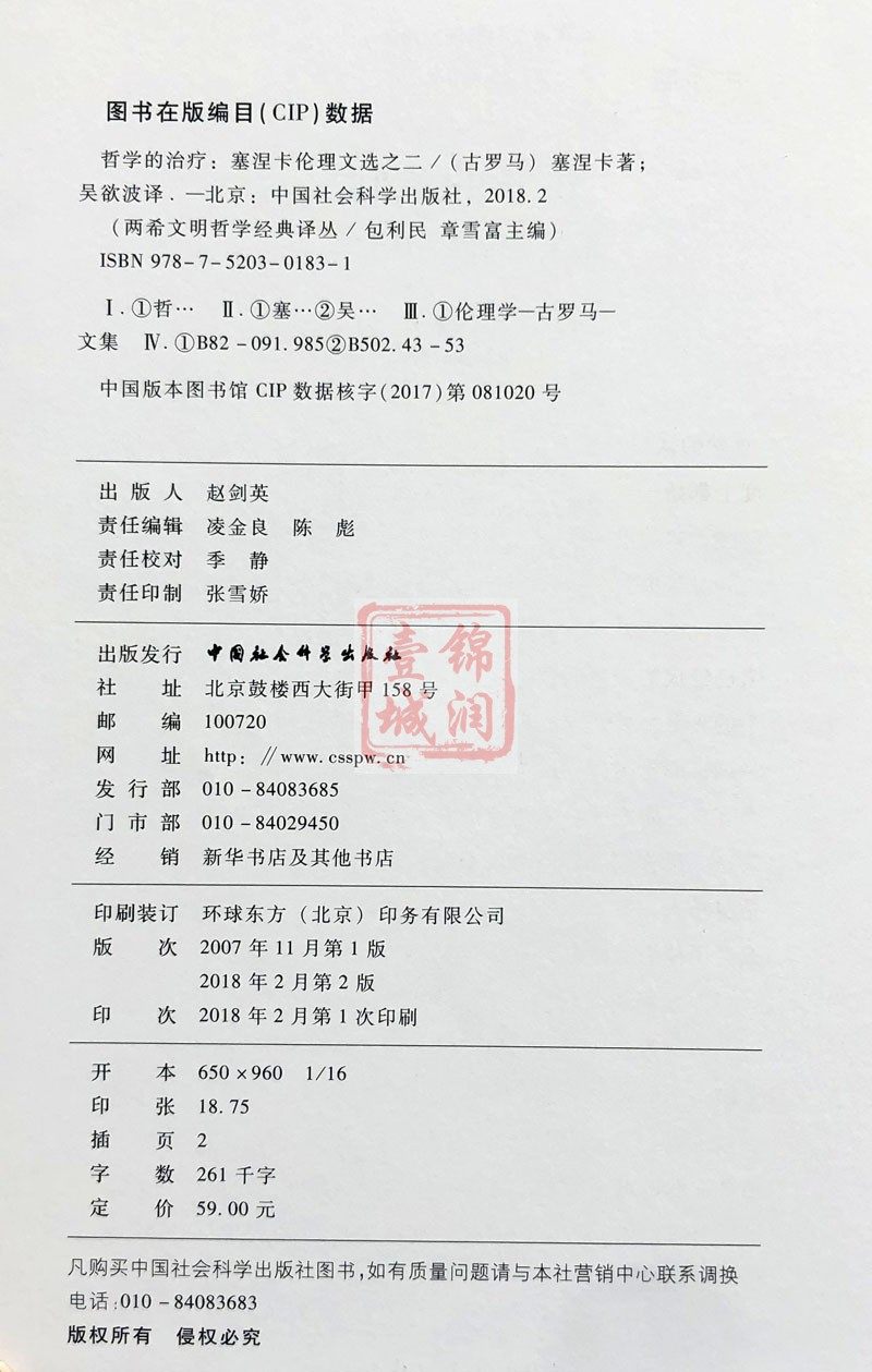 285页 社 两希文明哲学经典 塞涅卡著 吴欲波译 古罗马 塞涅卡伦理文选之二 丛书 中国社会科学出版 哲学 16开精装 治疗