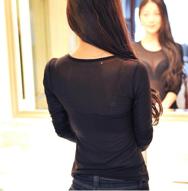 女装 T恤修身 2015秋新款 长袖 显瘦性感露背百搭弹力 韩版 网纱打底衫