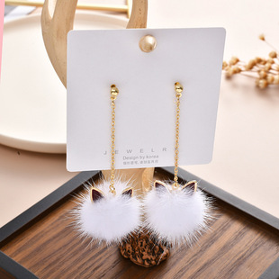 s925银秋冬新款 猫耳朵耳环女气质甜美流苏百搭耳夹 毛球耳钉2020款