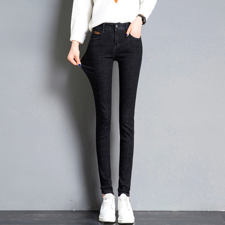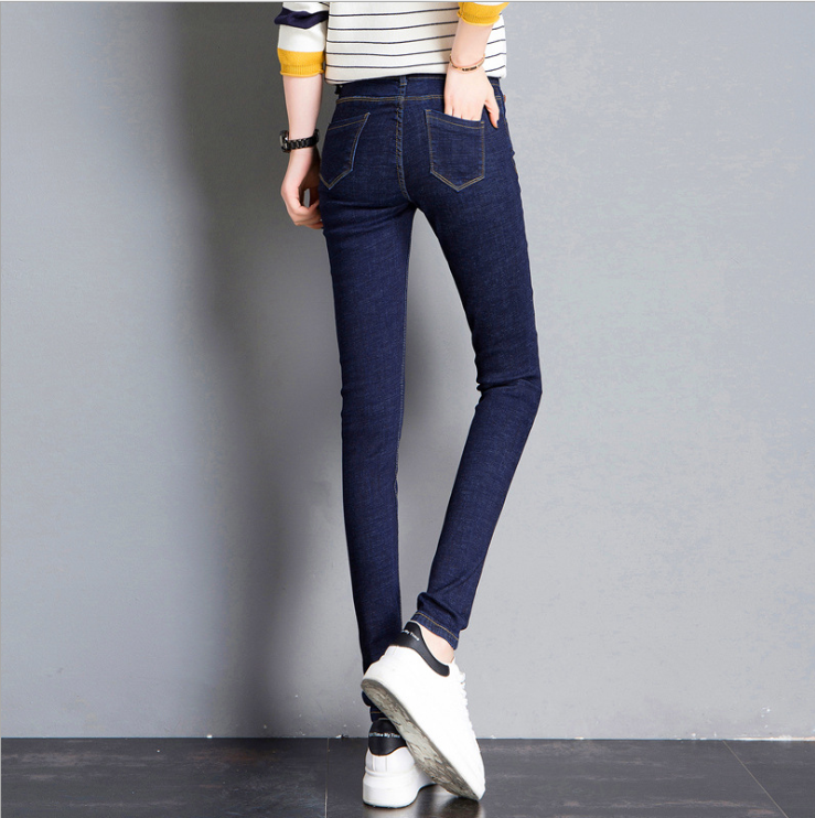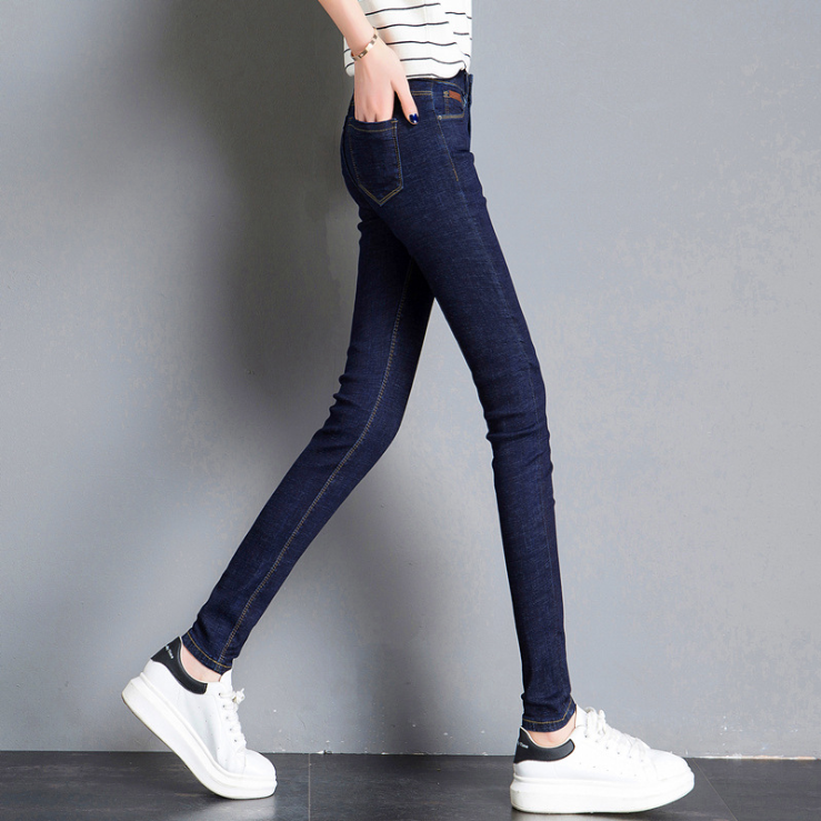 深蓝牛仔裤 女九分小个子秋薄绒厚绒高腰显瘦紧身显瘦弹力小脚长裤