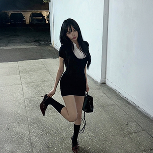 显瘦包臀短裙女夏季 gagaopt学院风翻领短袖 假俩件连衣裙纯欲修身