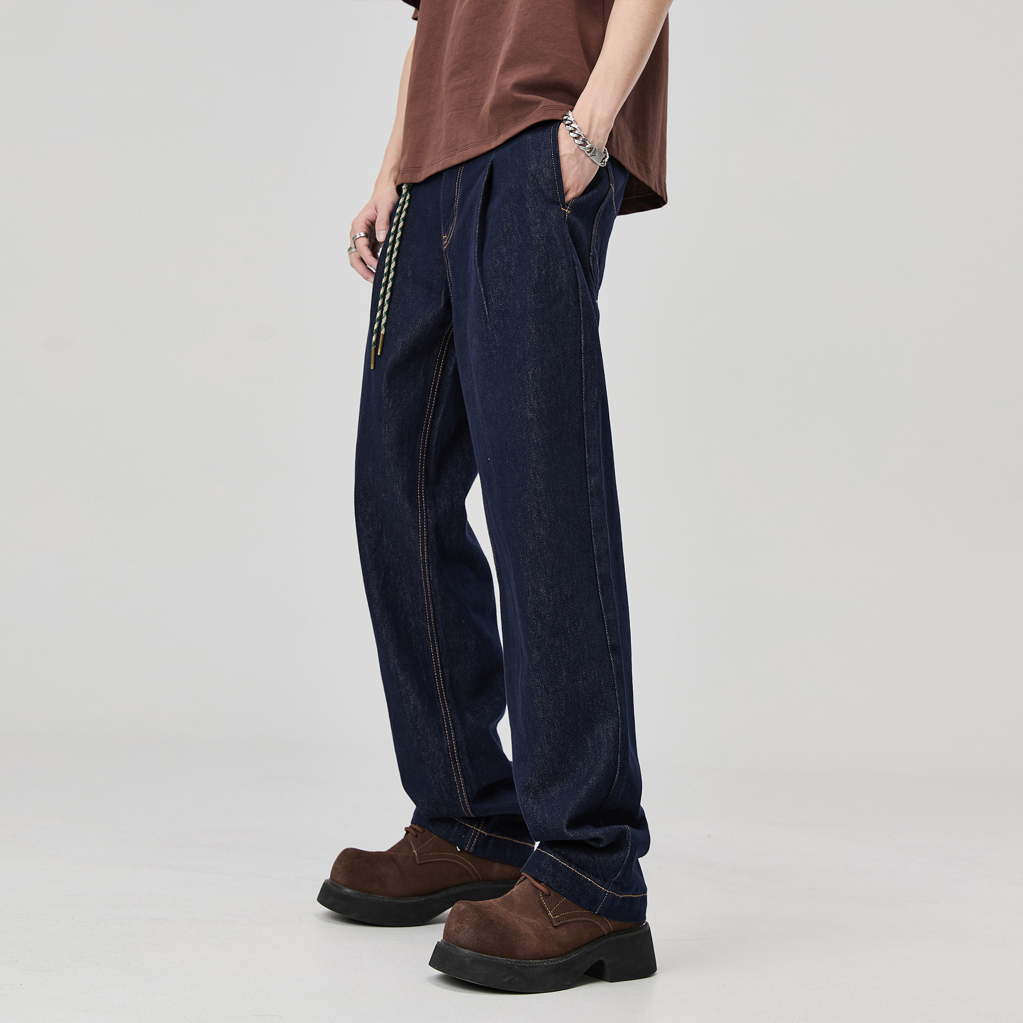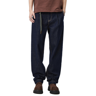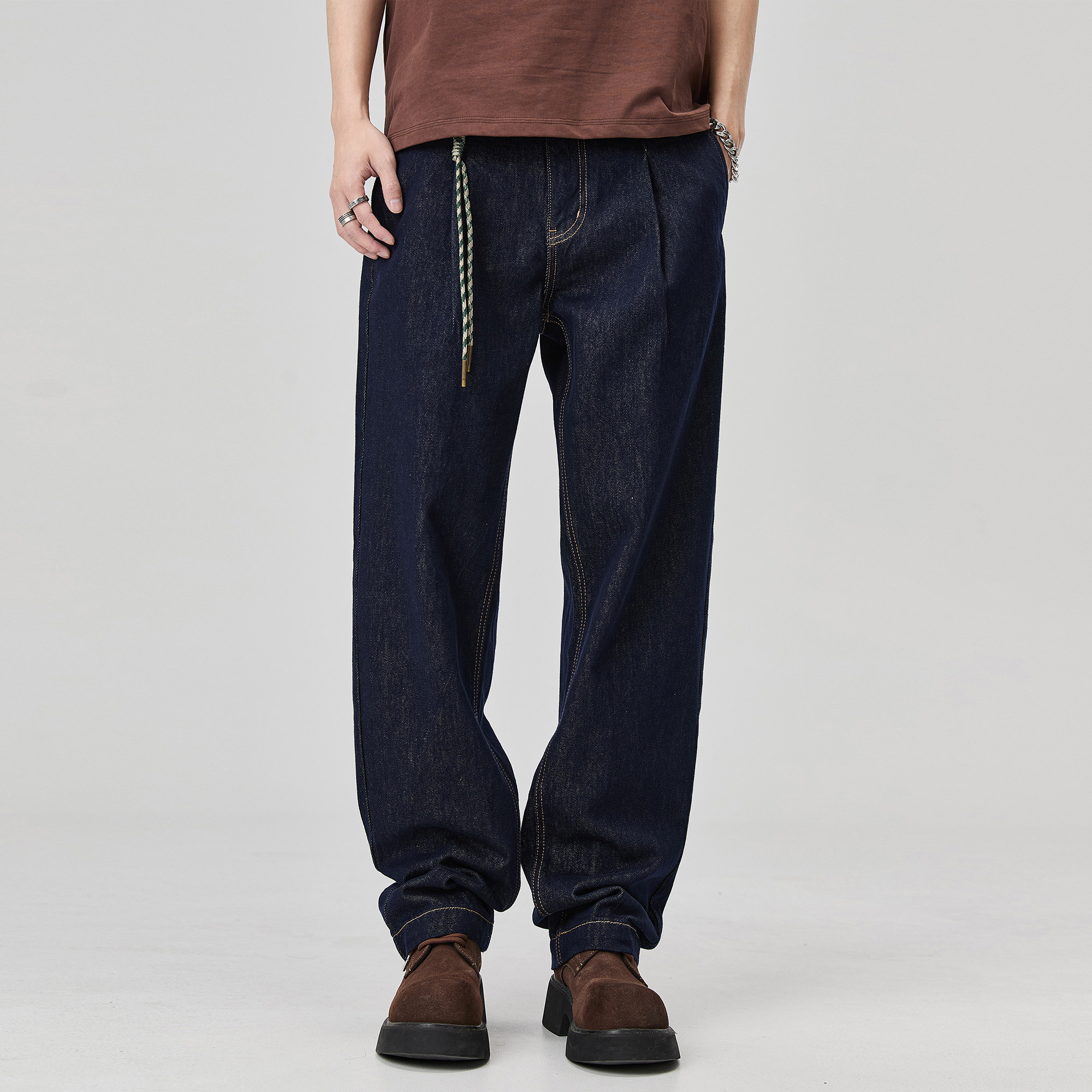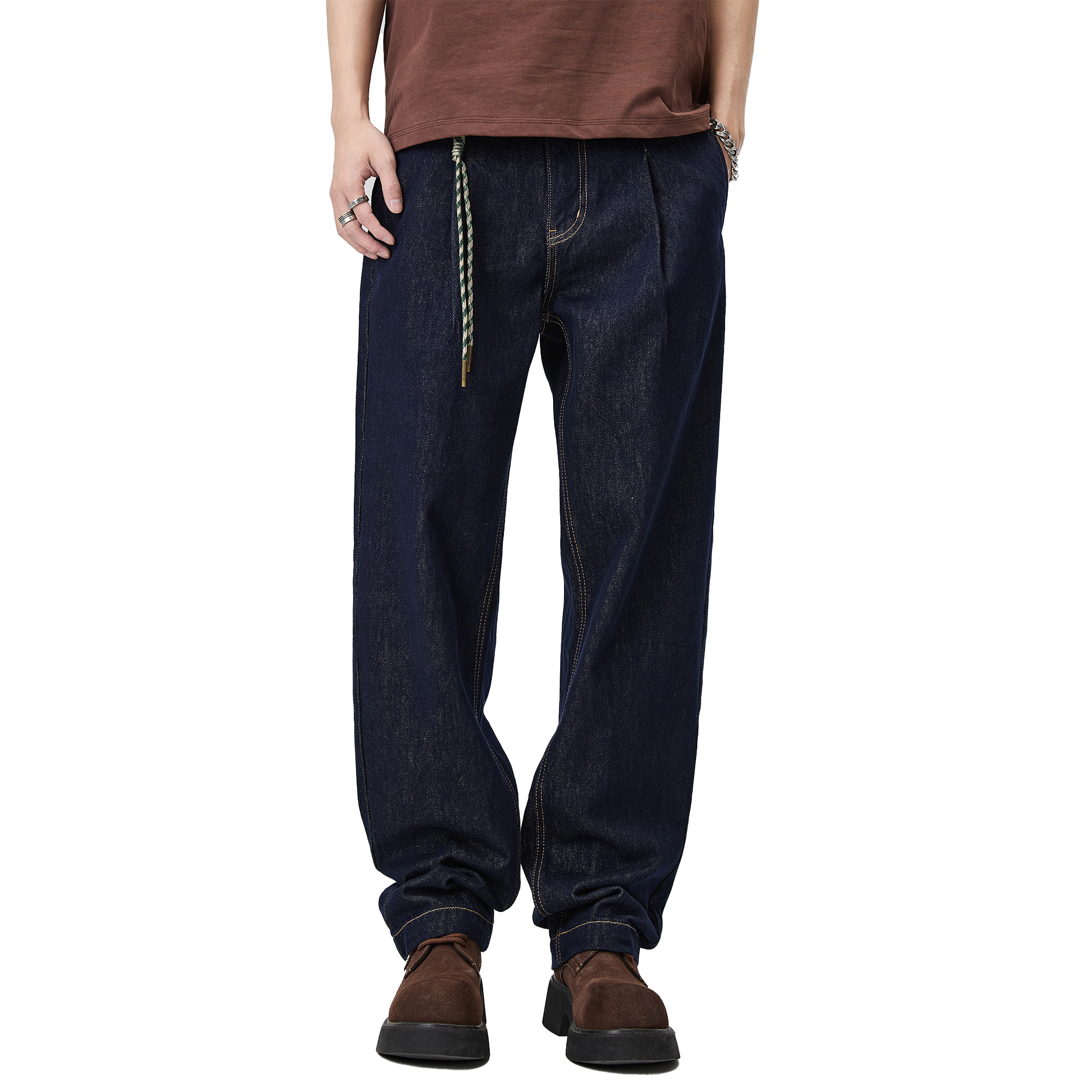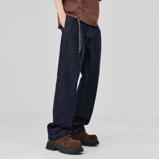 男春秋潮牌休闲宽松直筒垂感弯刀裤 高街深蓝色牛仔裤 子 美式 ALLIN