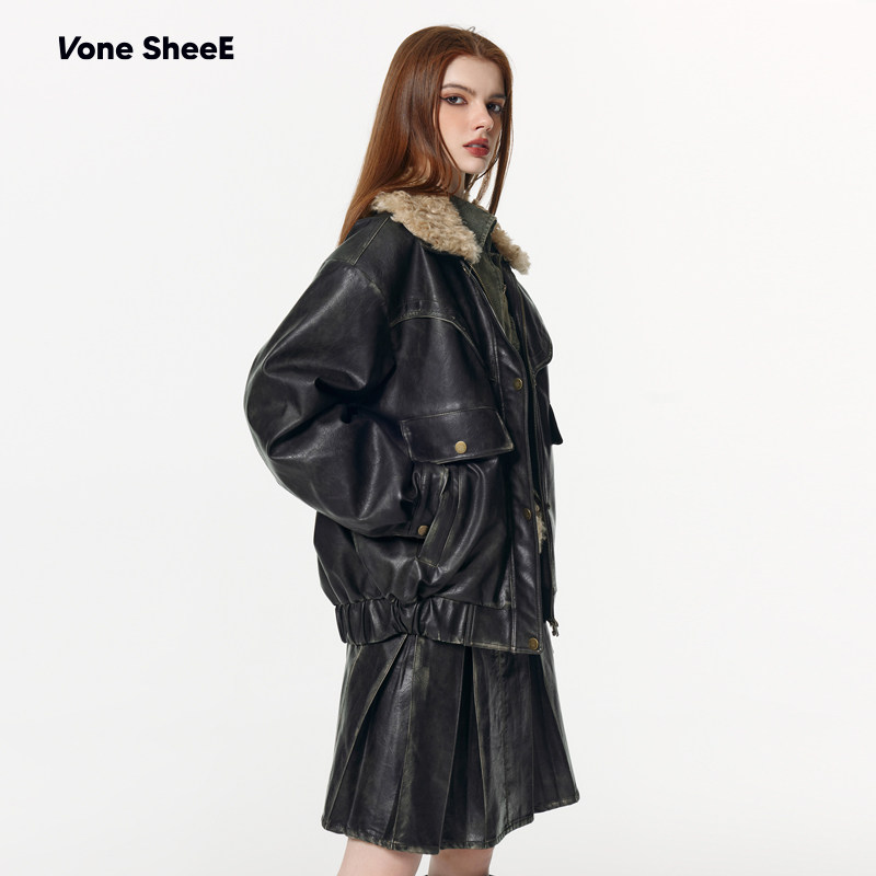 HEEMKIZOO日系复古秋冬款 男女皮衣外套潮牌 纯色翻领复古机车短款