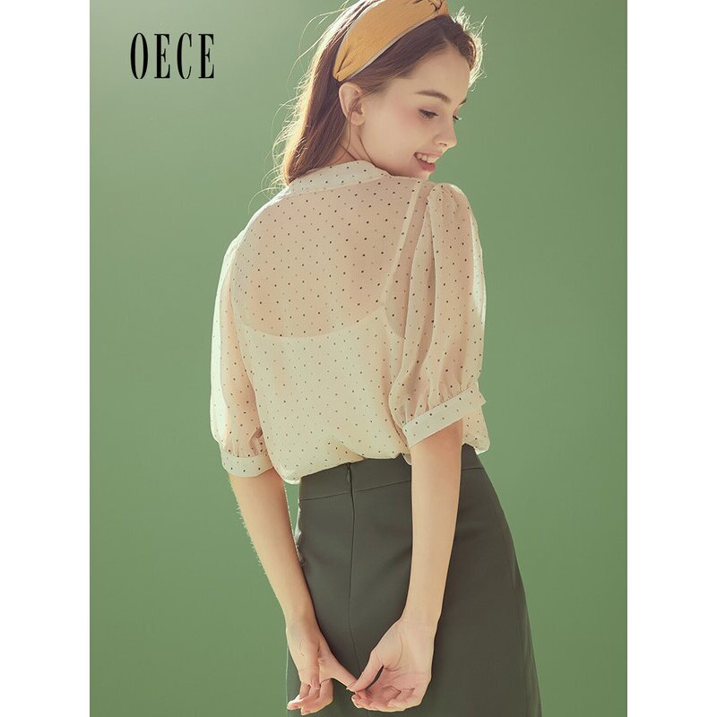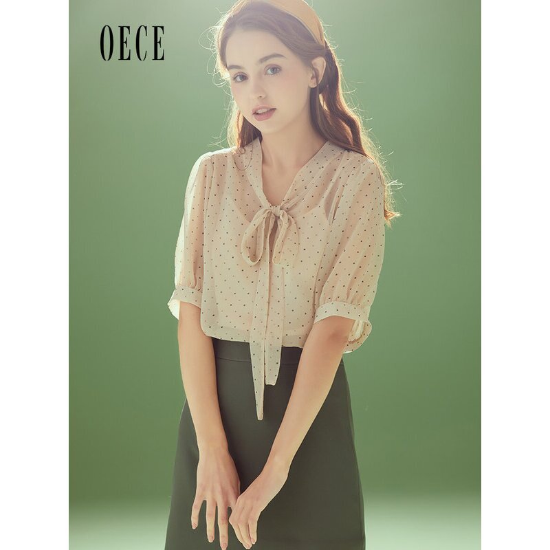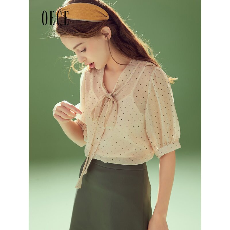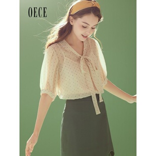 女装 衬衫 复古法式 波点雪纺衫 上衣 减龄系带短袖 Oece春夏新款