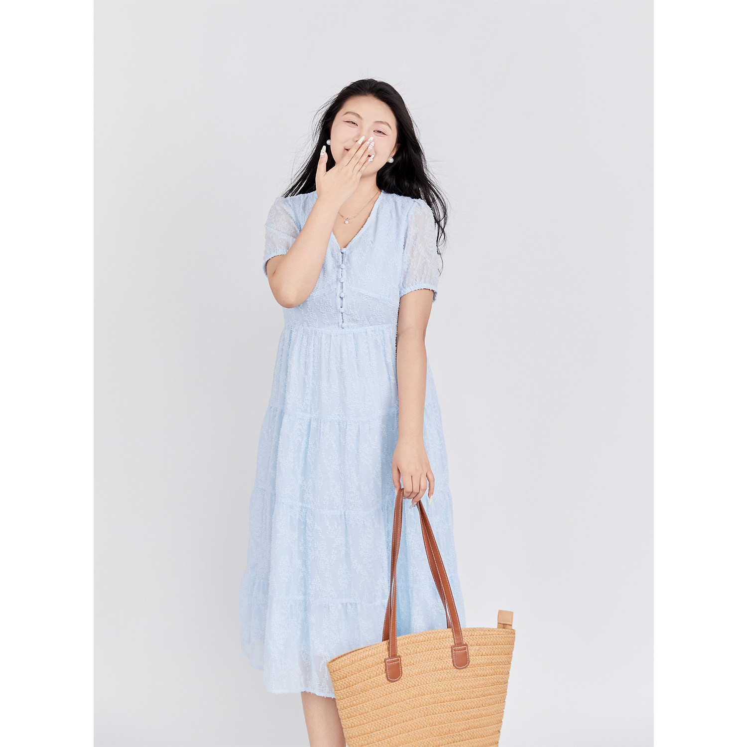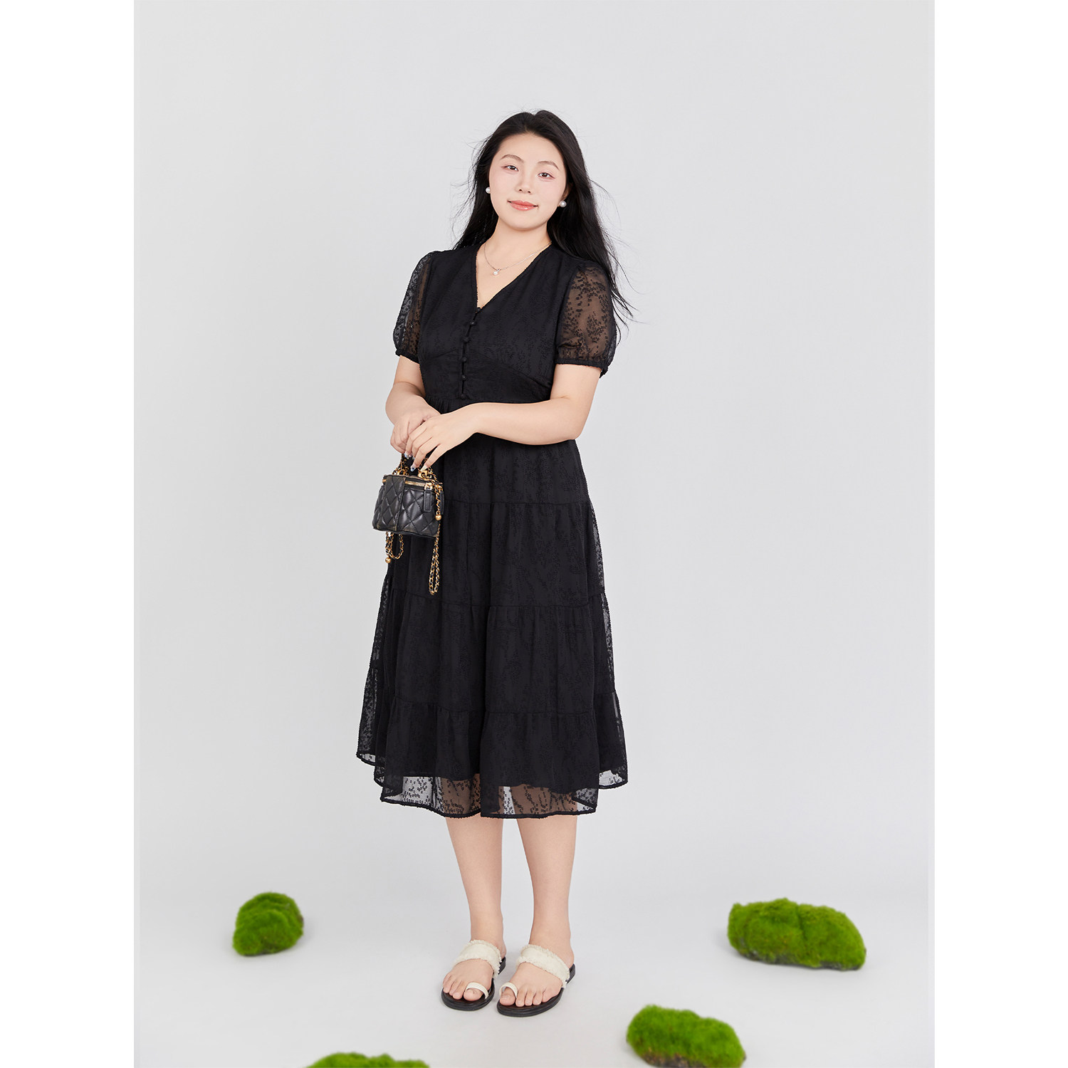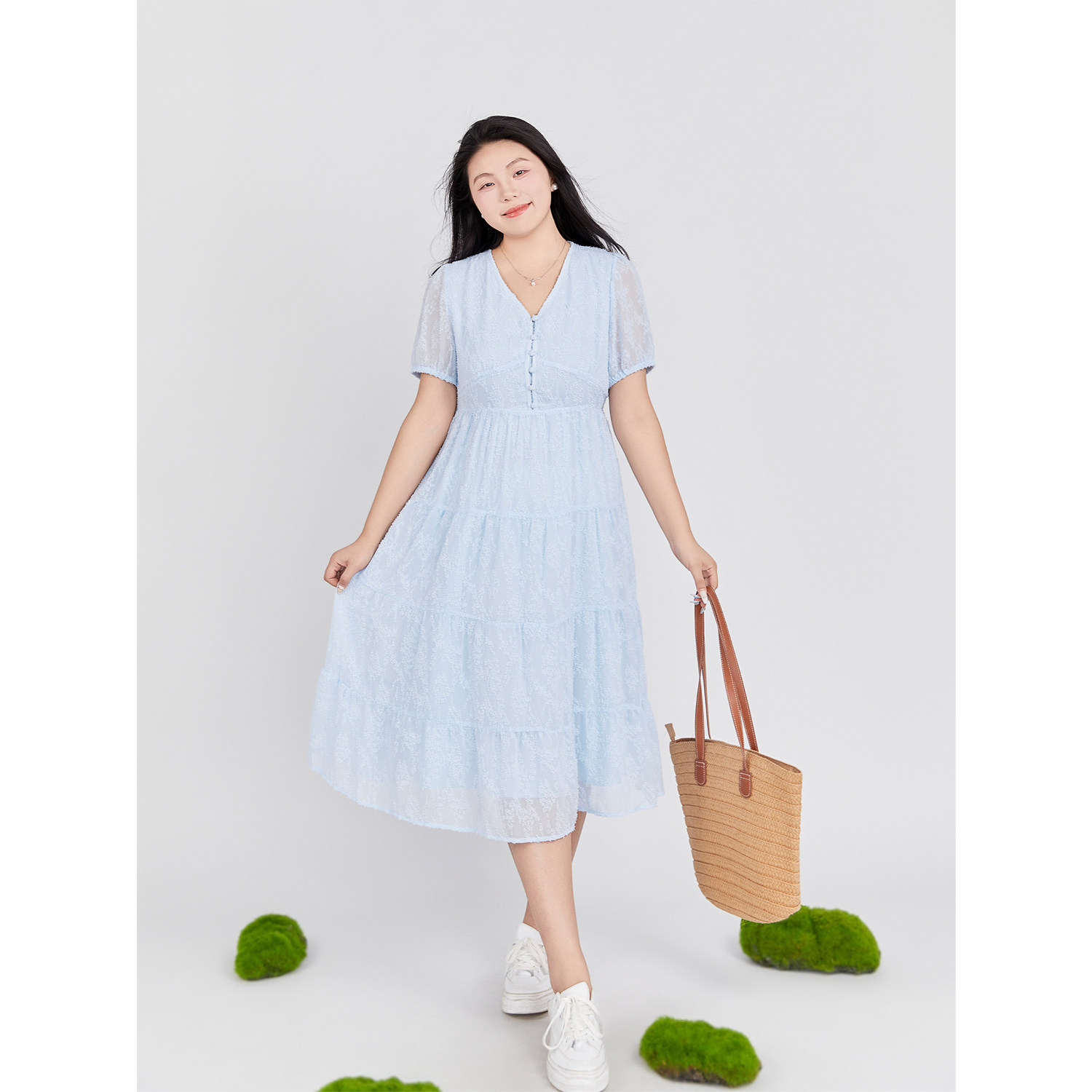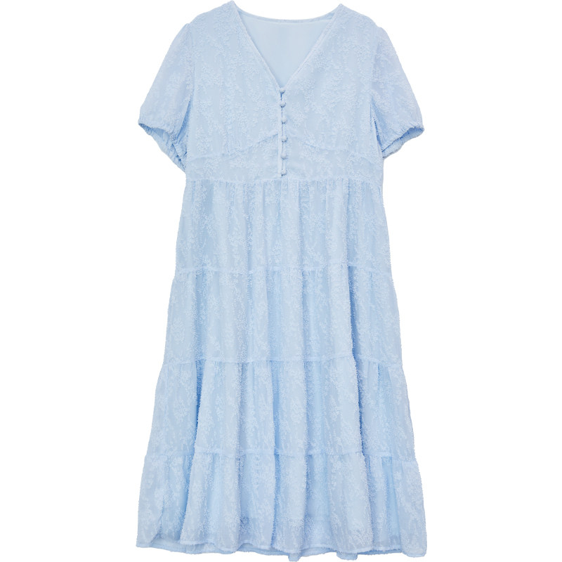 V领连衣裙 DM100大码 微胖mm 夏季 肌理提花简约雪纺连衣裙 女装