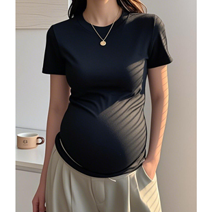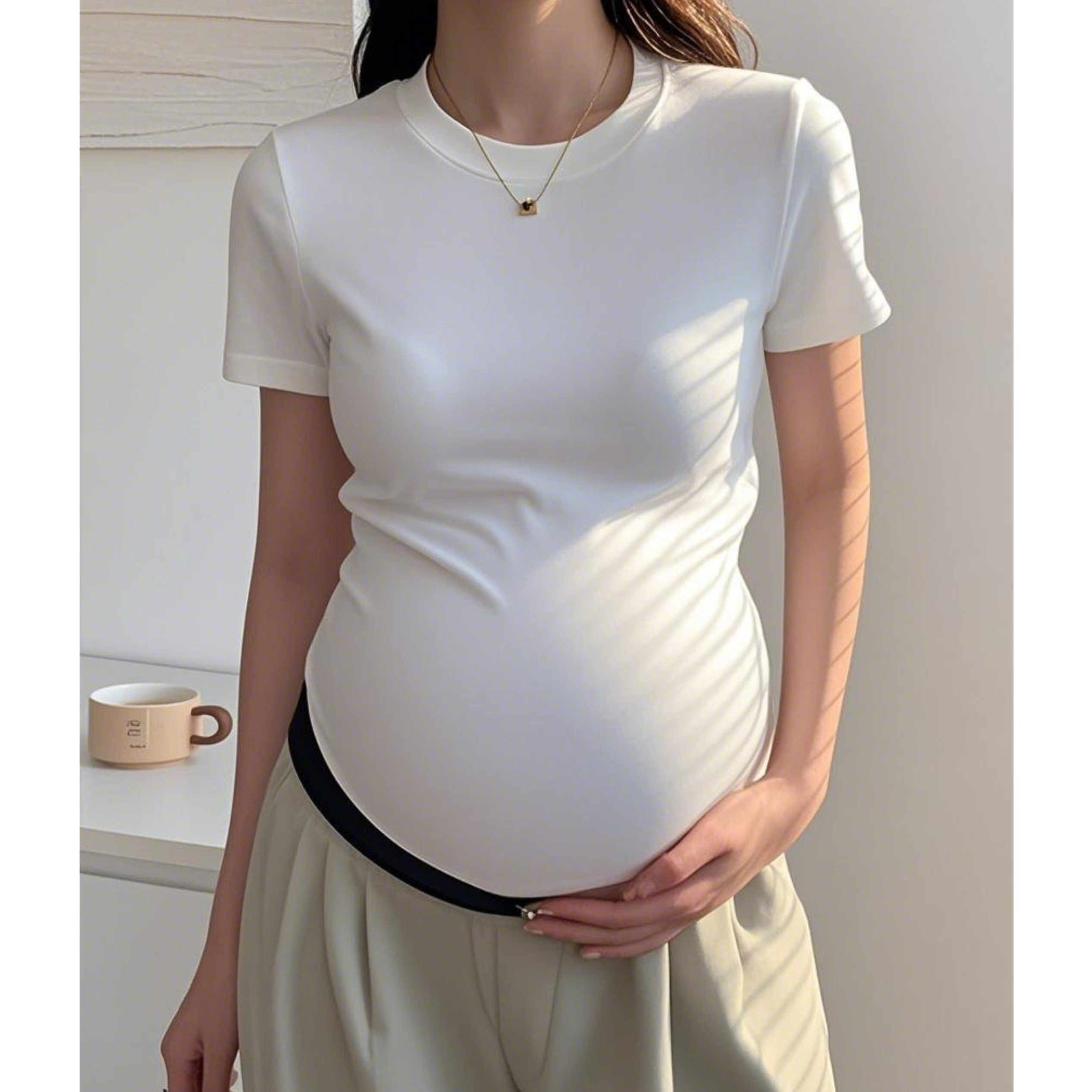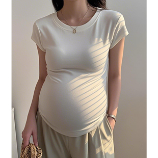 小众正肩高腰收腰上衣弹力T恤衫 2025新款 女夏季 孕妇白色圆领短袖