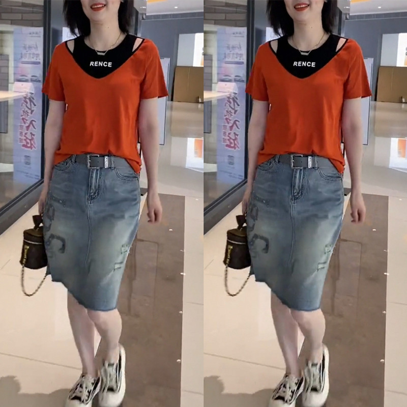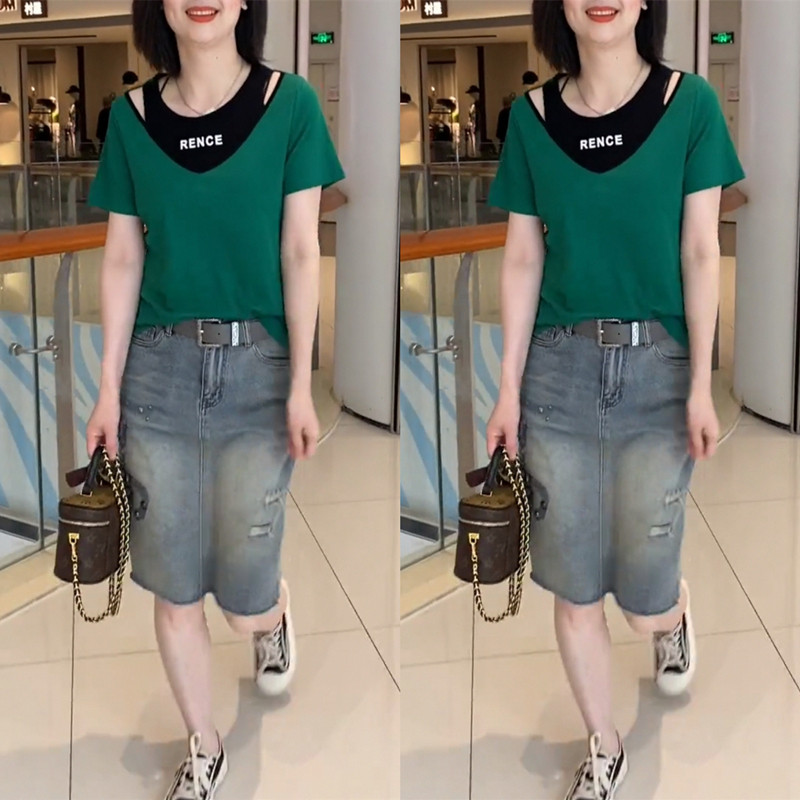 女装 遮肉短袖 胖mm韩版 新款 t恤百搭显瘦假两件上衣 夏季 300斤特大码