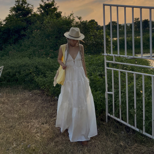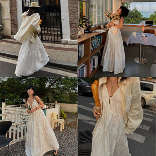 MOERSHOP 宽松气质长裙 浪漫罗曼史度假风深V吊带白色连衣裙女新款