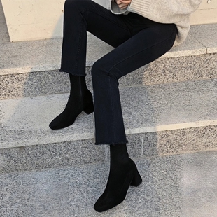 女八九分小个子梨型身材高腰显瘦喇叭裤 秋冬季 加绒黑色微喇牛仔裤