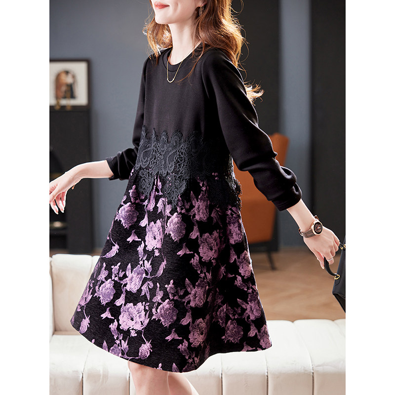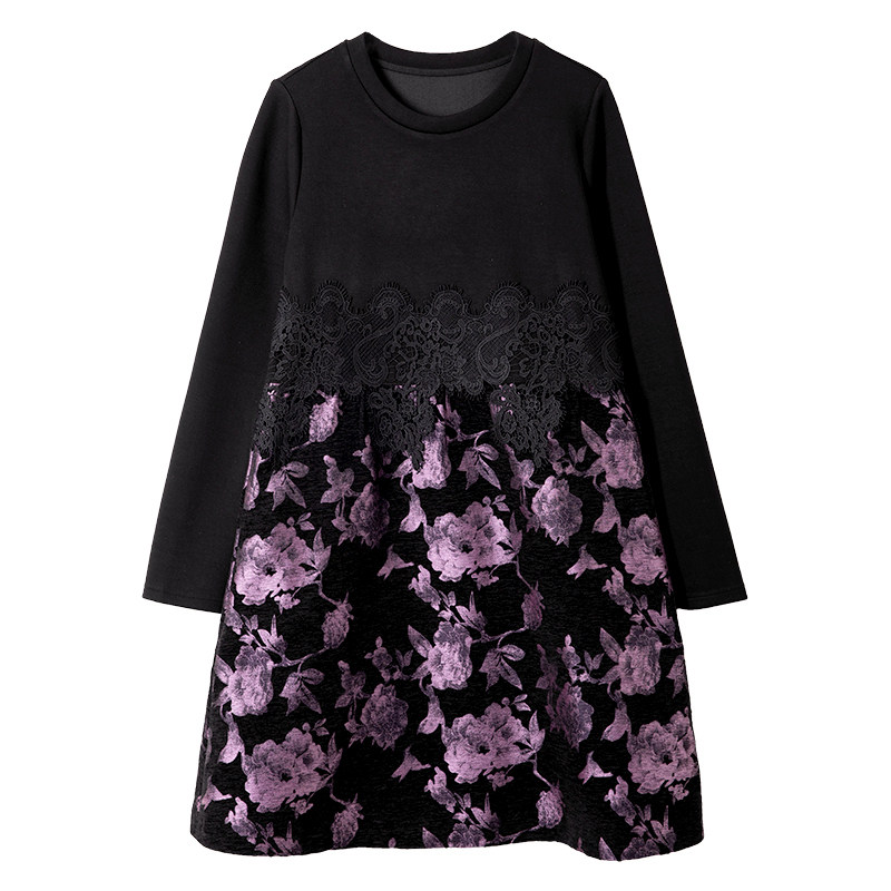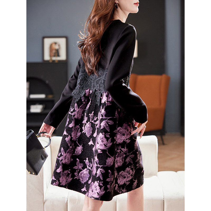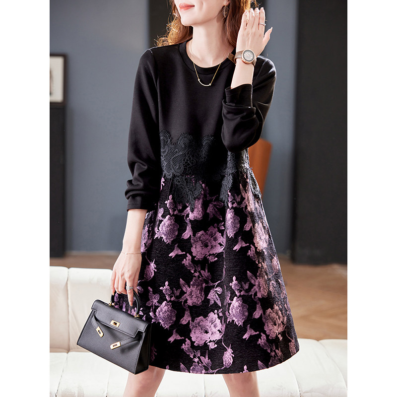 宝诗黎圆领蕾丝提花拼接连衣裙2026春季 A字裙女 气质减龄洋气时尚