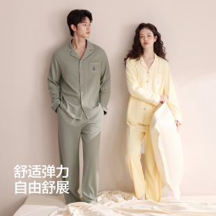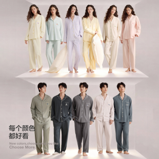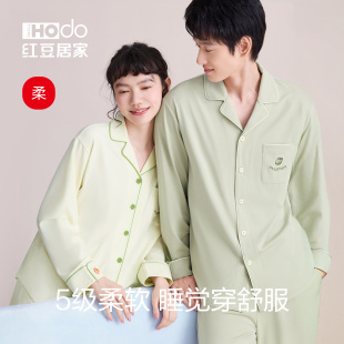 男春夏薄款 A类抗菌防螨纯棉情侣睡衣女长袖 红豆带胸垫家居服套装