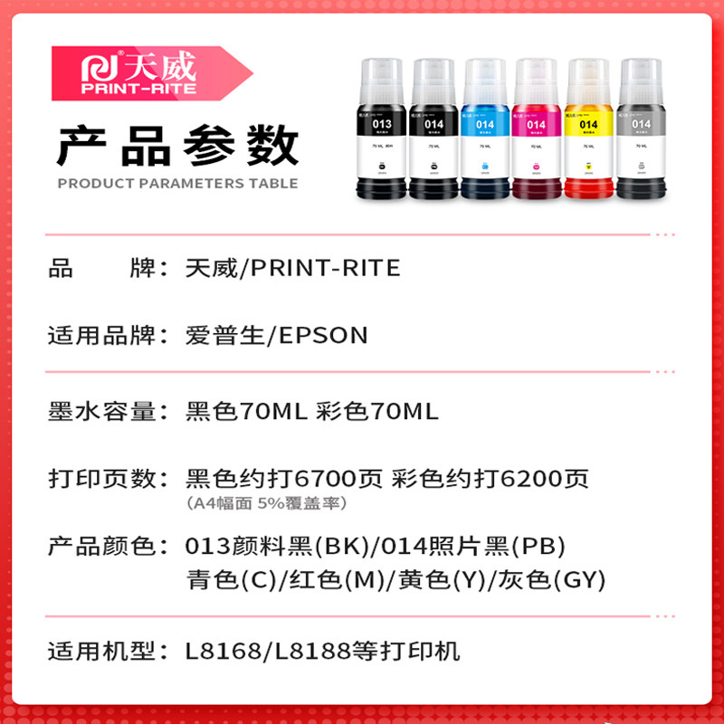 墨水 L8188 013 014 填充补充连供照片墨汁Epson 天威原装 喷墨打印机六色通用黑色彩色瓶装 适用爱普生LL8168