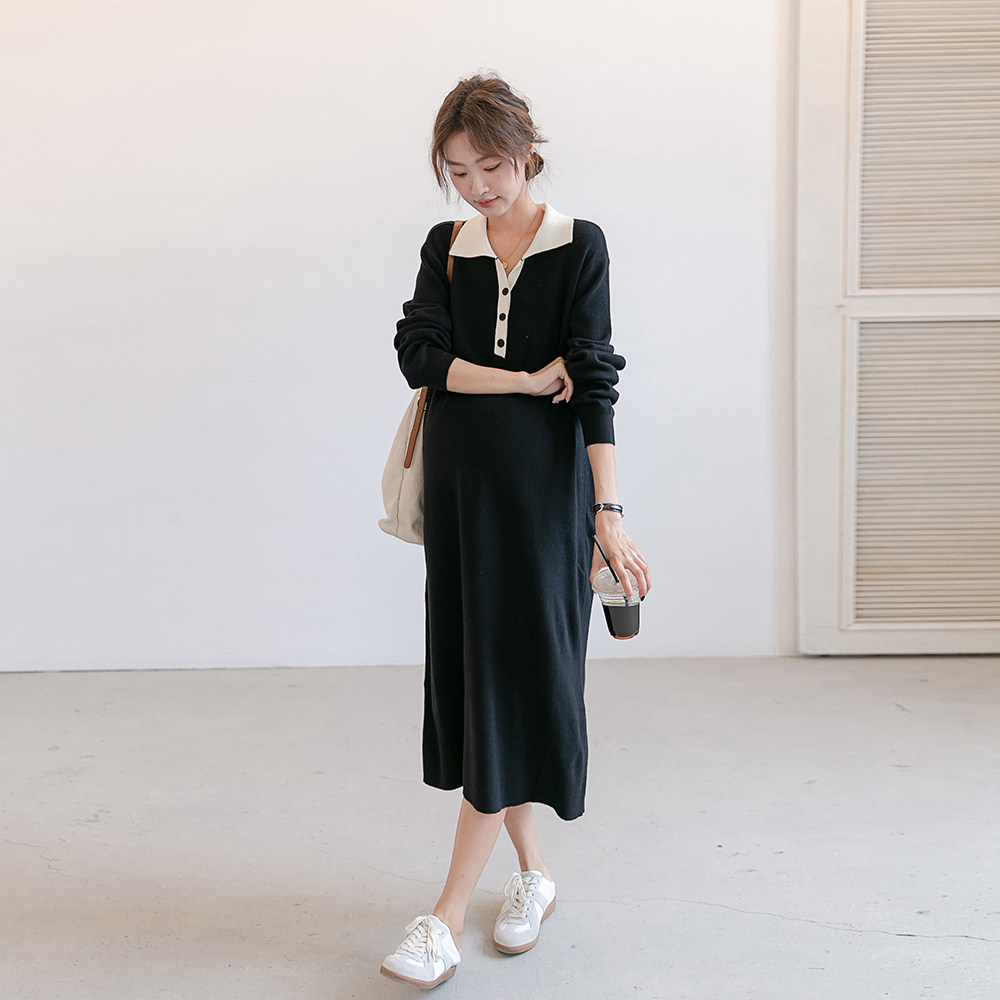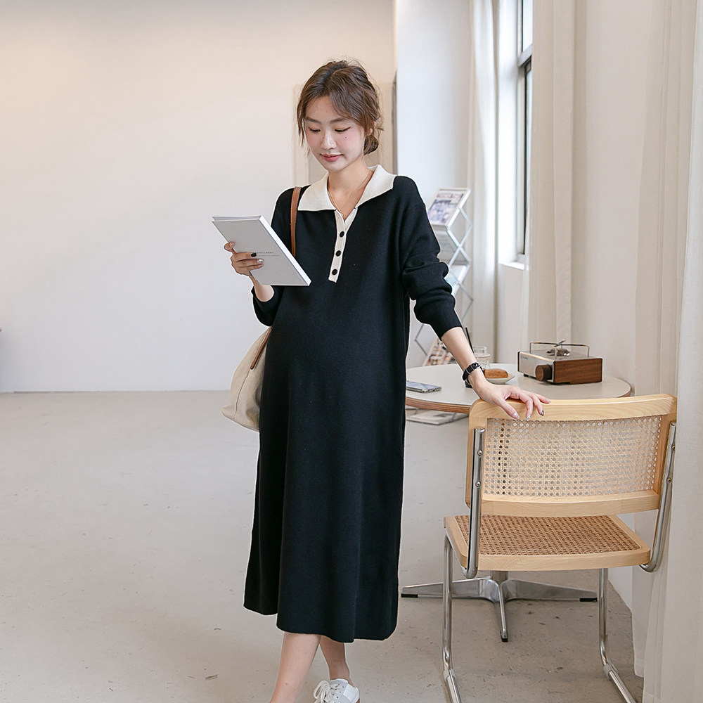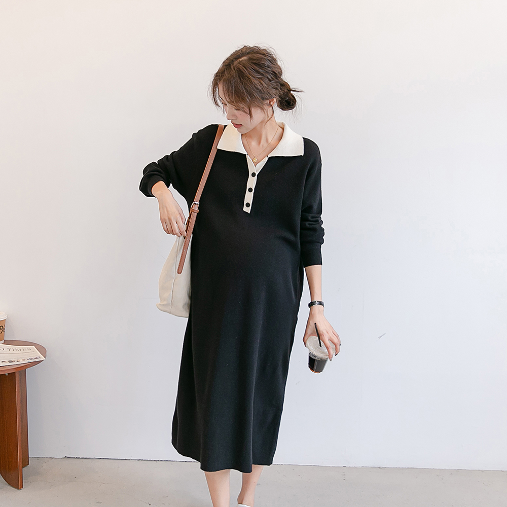 撞色翻领毛衣裙子中长款 连衣裙时尚 针织孕妇裙秋冬 春装 洋气孕妇装