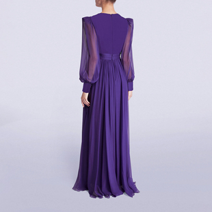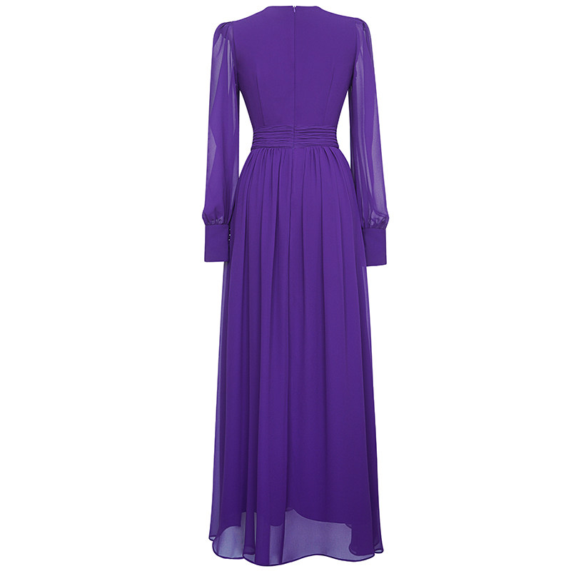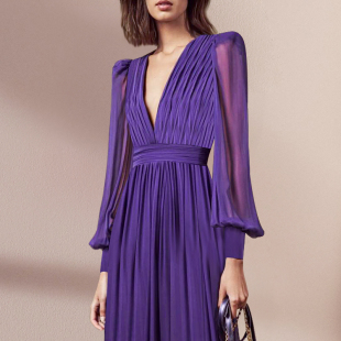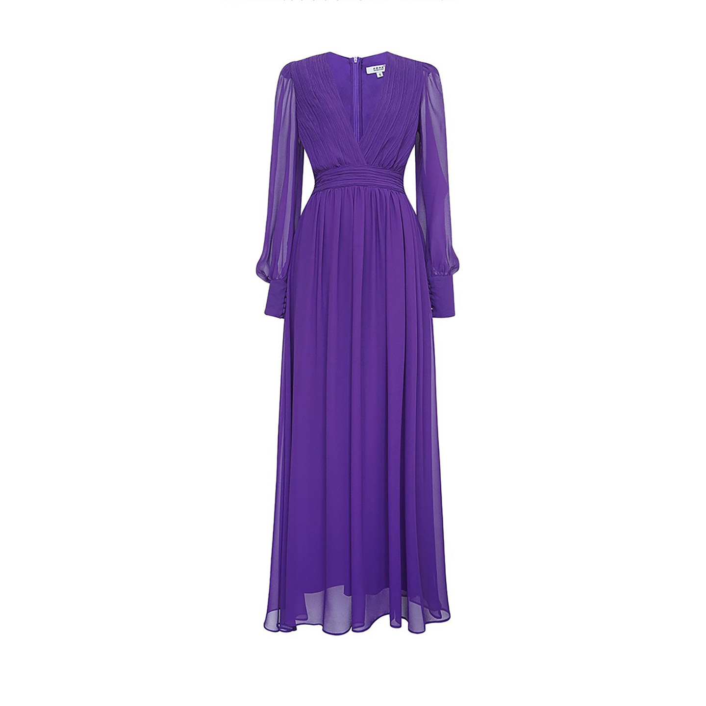 优雅长裙气质礼服 褶皱性感V领裙子长袖 法式 独特紫色连衣裙女修身