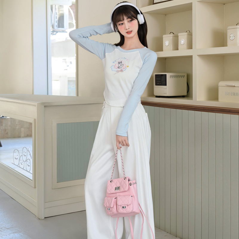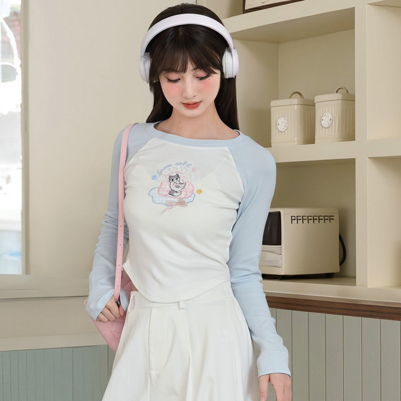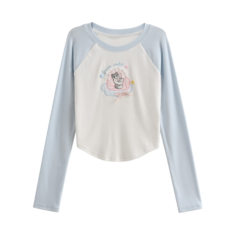 上衣百搭圆领T恤女2026新款 森女部落甜美风可爱猫咪刺绣修身 长袖