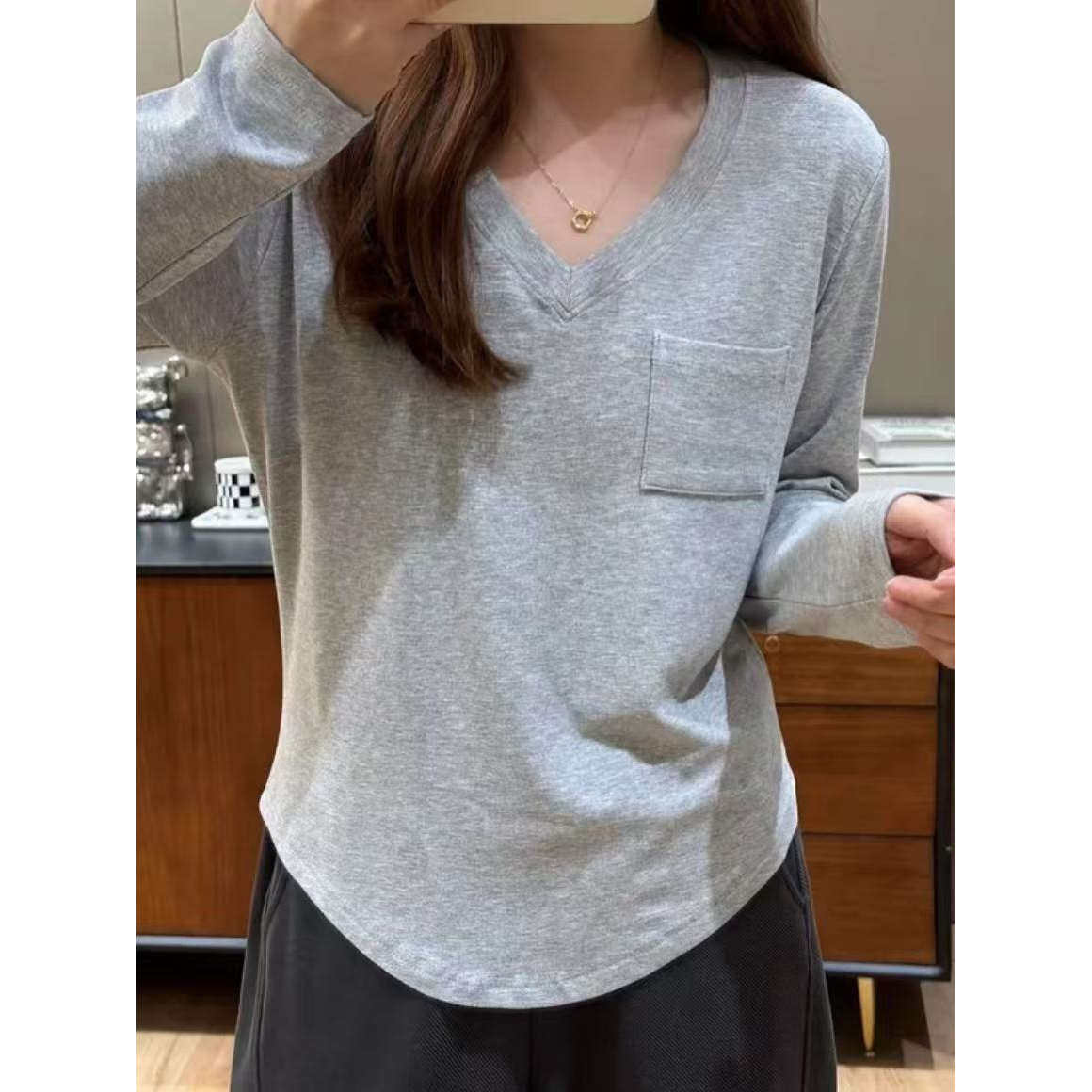 显瘦V领正肩长袖 大码 胖妹妹弧形下摆修身 2026春秋新款 T恤上衣 女装