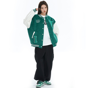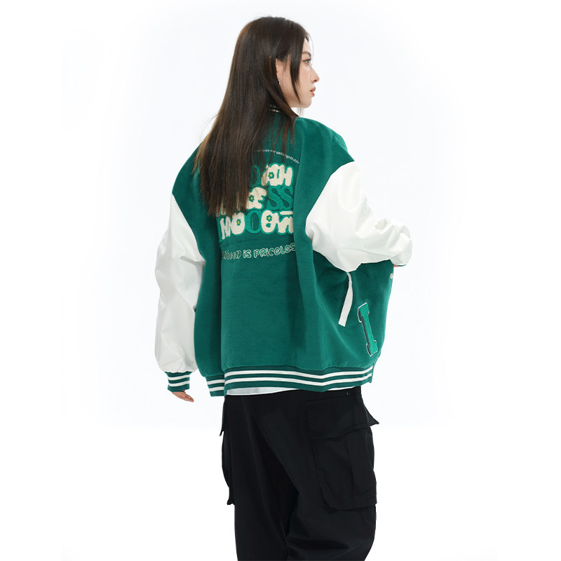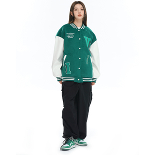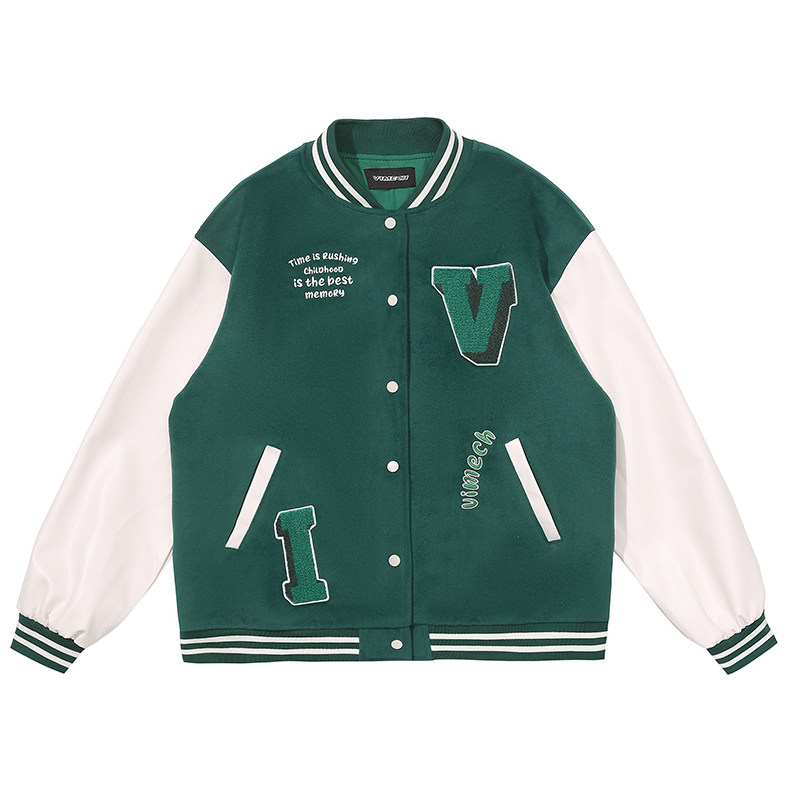 学院拼接夹克pu绿色棒球服宽松开衫 美式 夹棉外套 女款 vimech25男款