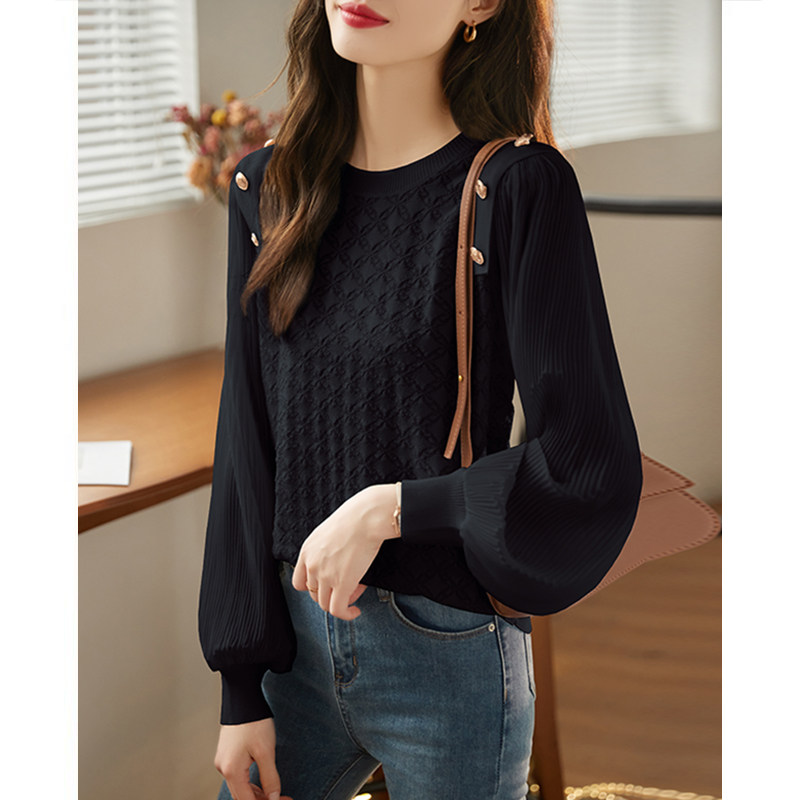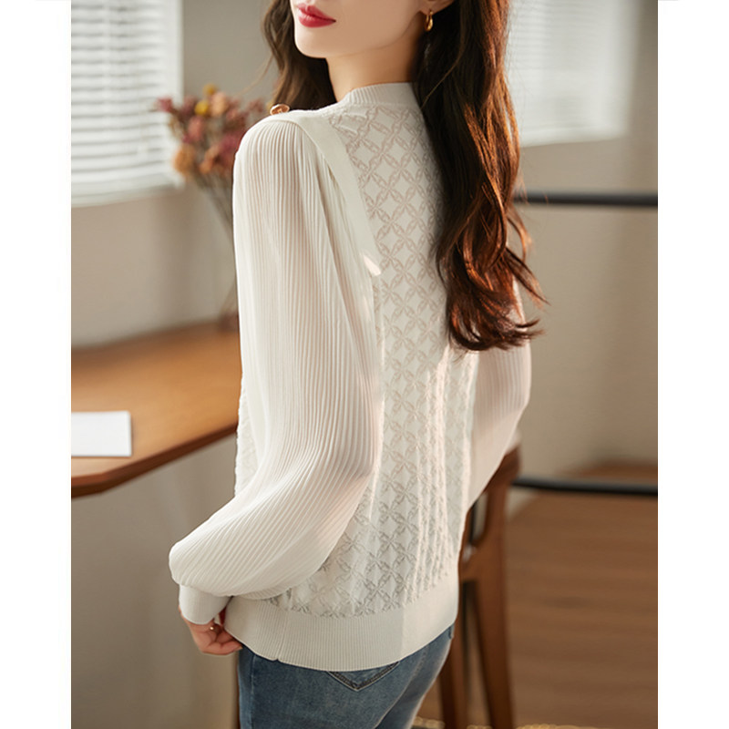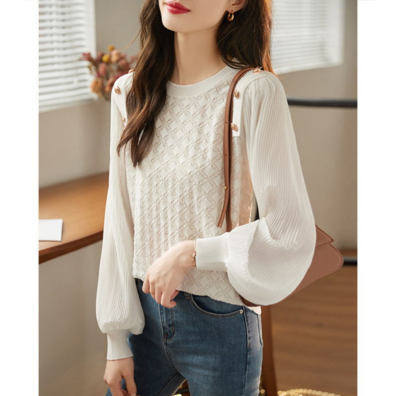 打底漂亮小衫 法式 宽松白色针织衫 上衣女春秋新款 洋气蕾丝雪纺衬衫