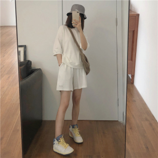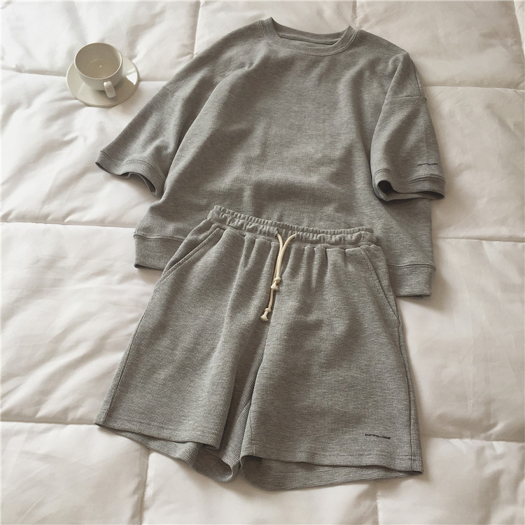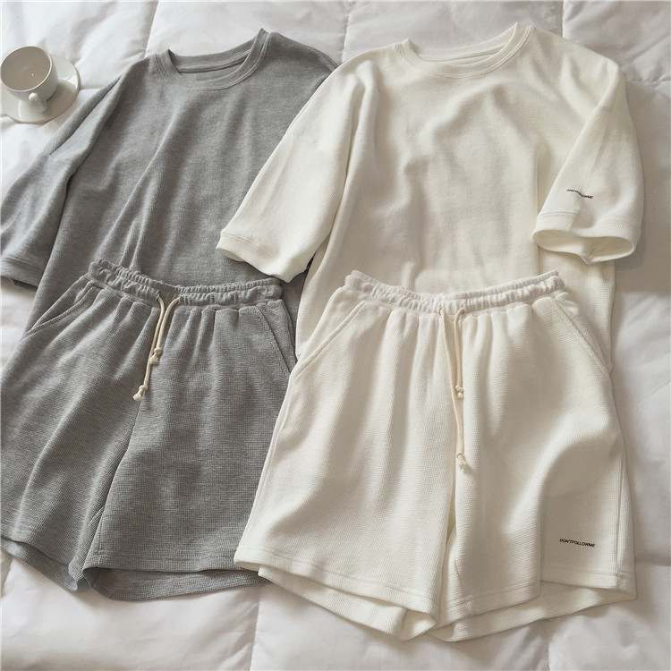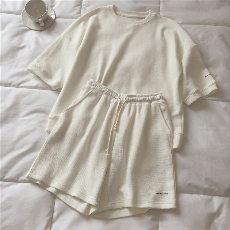 宽松休闲套装 T恤夏装 潮 短袖 超火cec华夫格两件套女松紧腰阔腿短裤