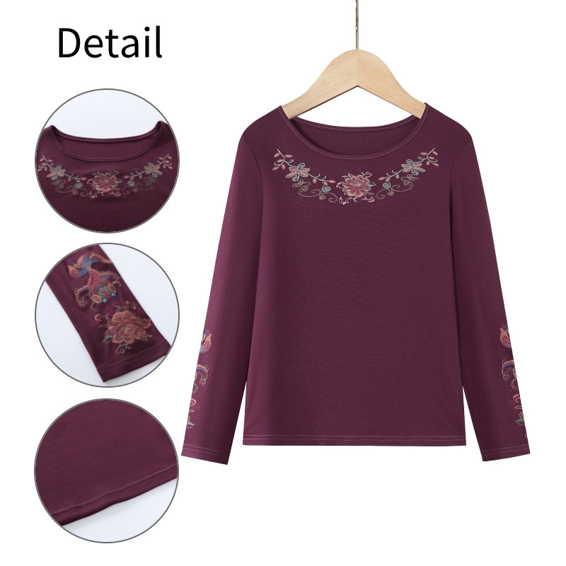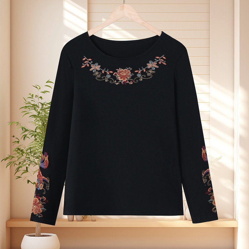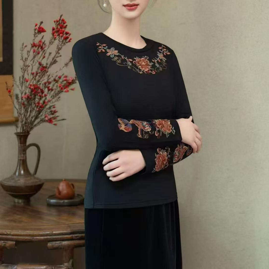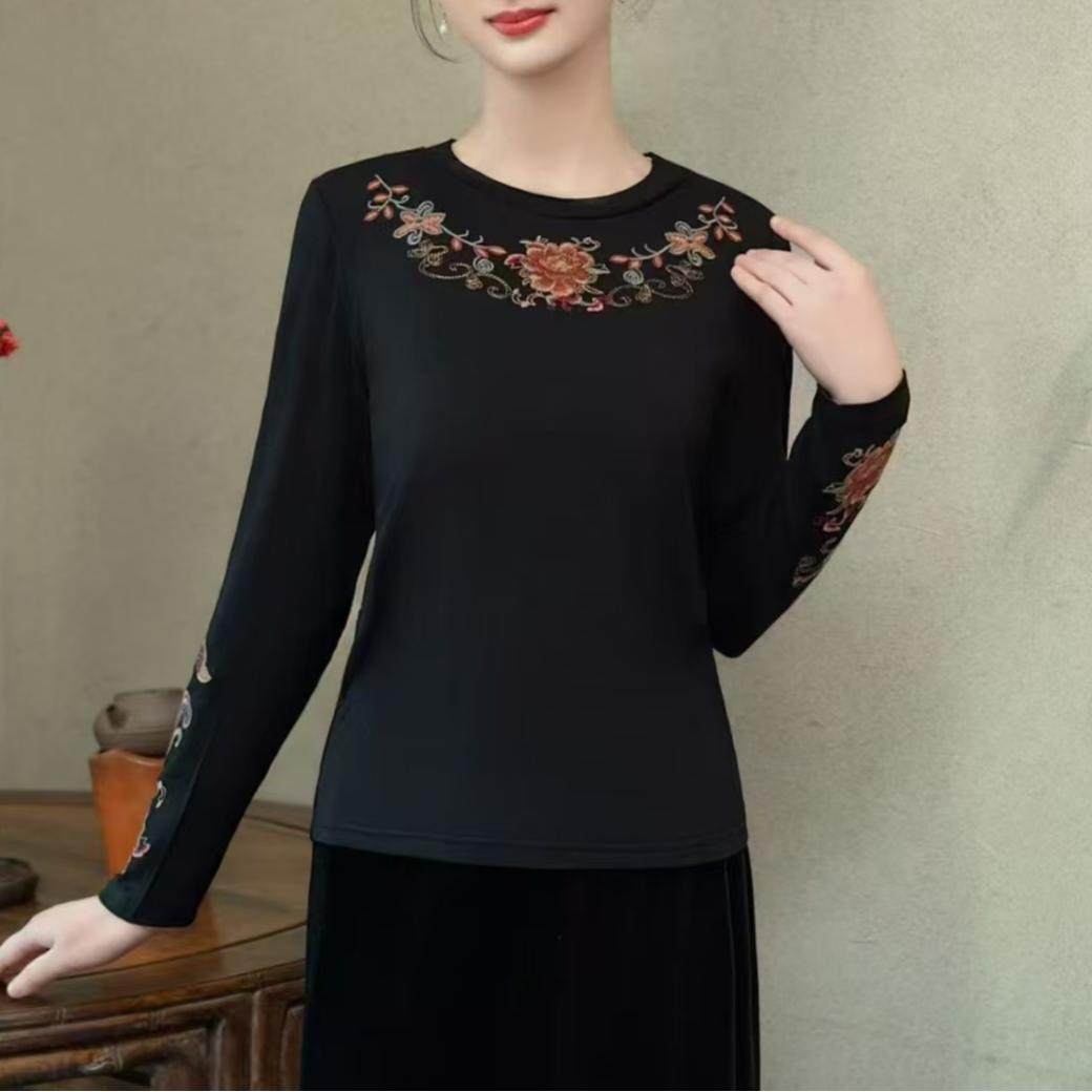民族风内搭长袖 国风刺绣显瘦T恤打底衫 圆领上衣 春秋新款 中年女装