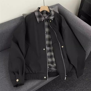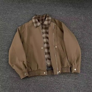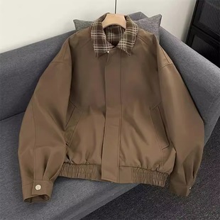 复古假两件飞行夹克男美拉德穿搭格纹拼接棒球服美式 休闲棕色外套