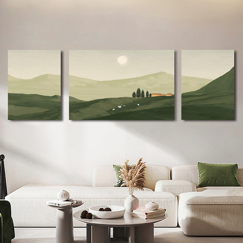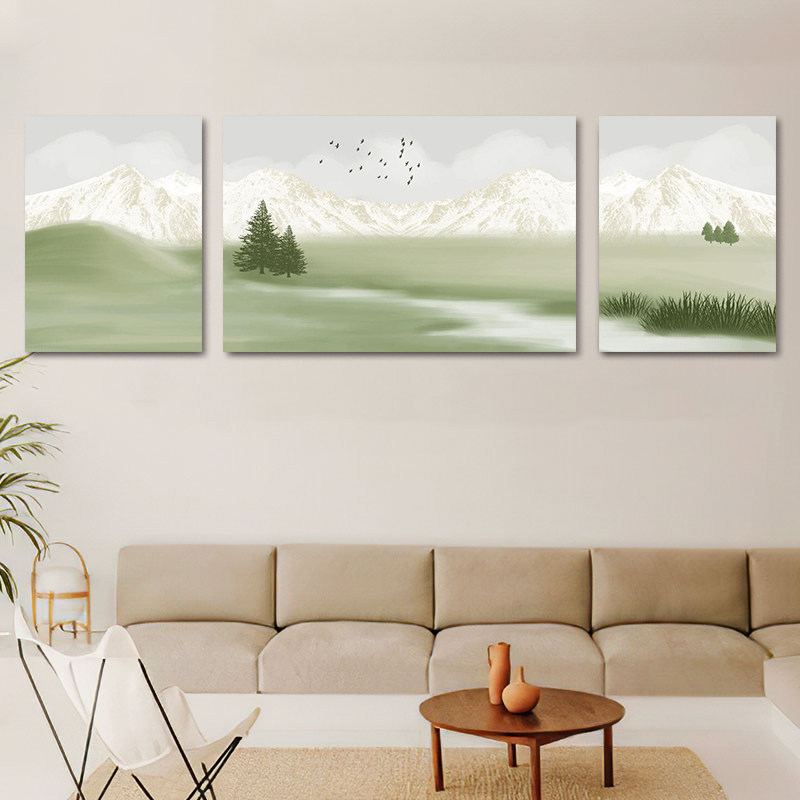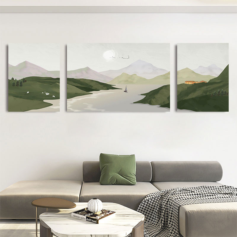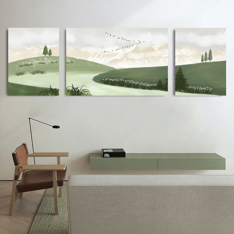 油画风山间风景三联无框画卧室客厅小清新装 饰画冷色系背景墙挂画