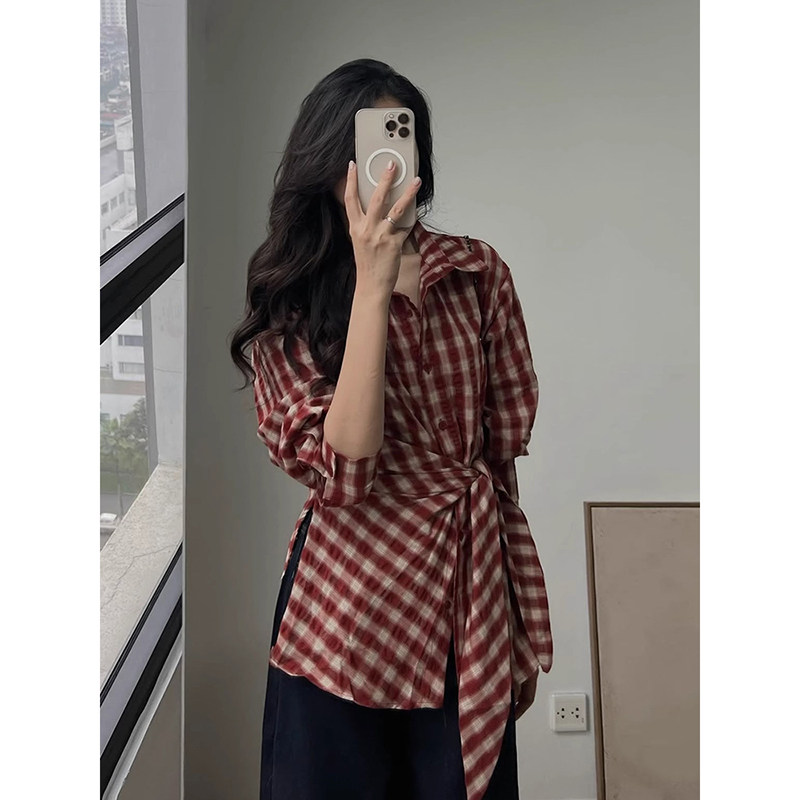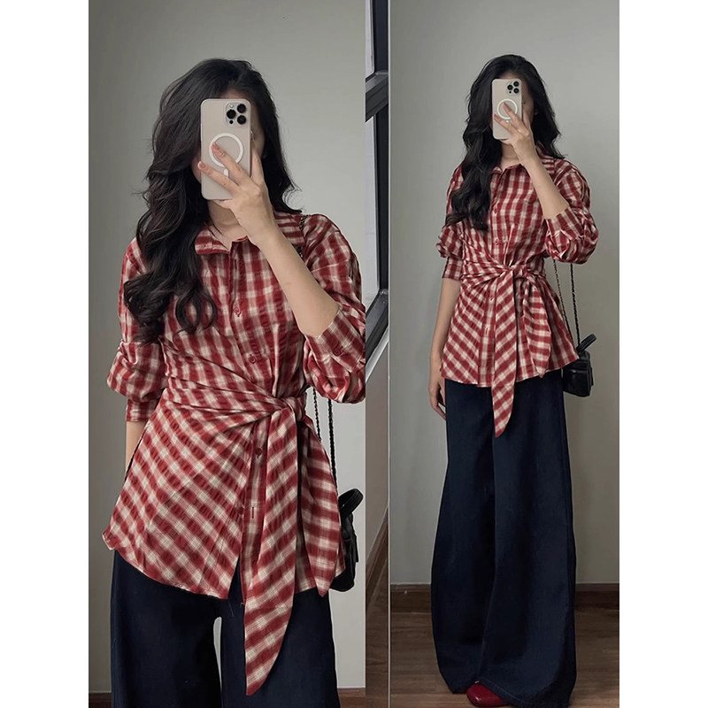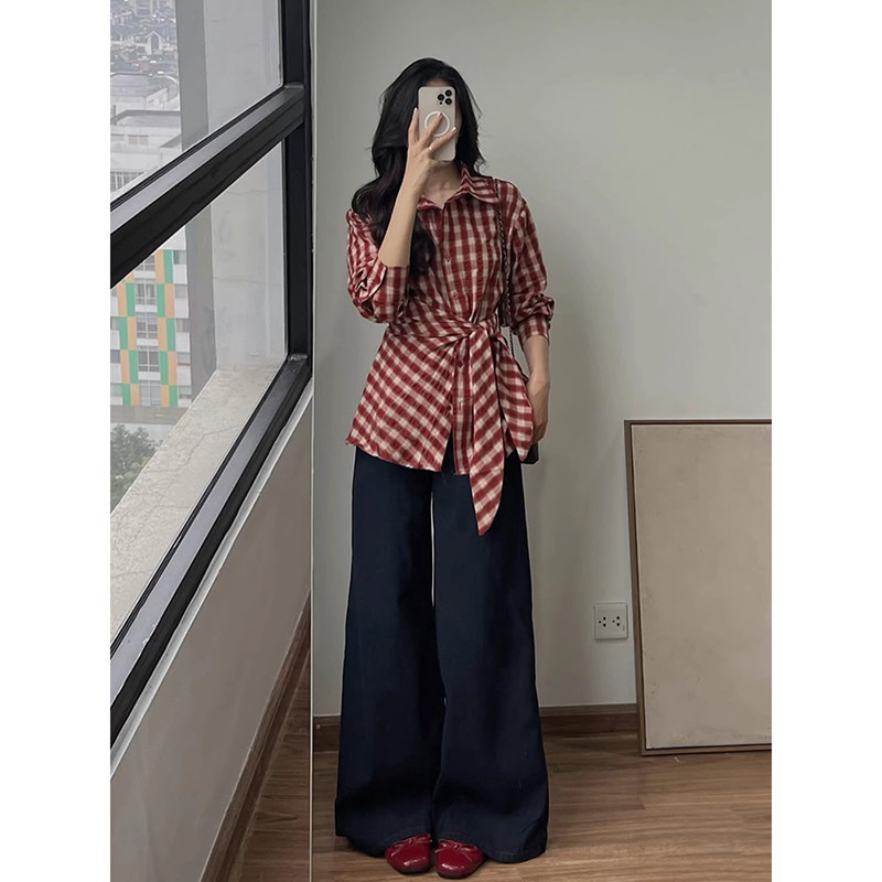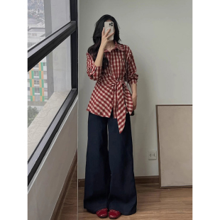 套装 良良家绑带收腰格子衬衫 复古港风高腰显瘦牛仔长裤 新款 女春季