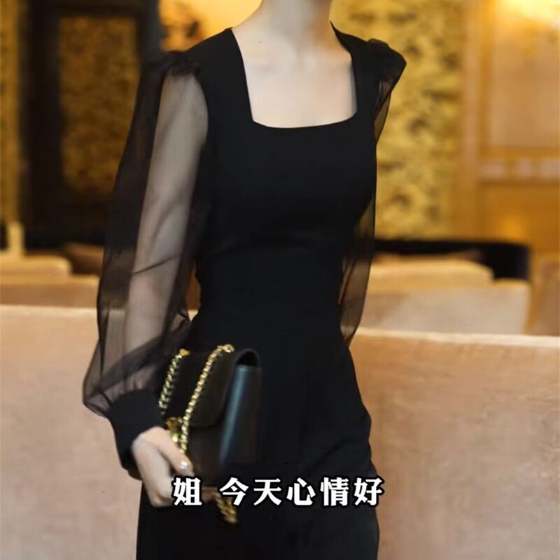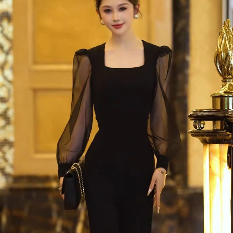 春季 女士连体裤 新款 子拼接修身 减龄洋气赫本风网纱袖 轻奢网红爆款