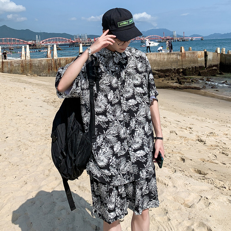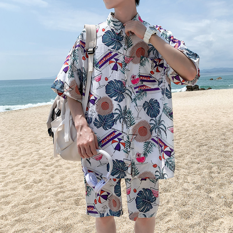 男速干夏季 花色短裤 冰丝短袖 潮流大码 情侣搭配两件套 衬衫 沙滩套装