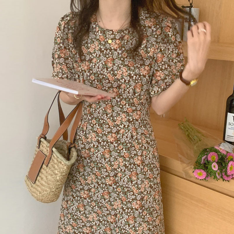 碎花泡泡袖 优雅简约圆领系带收腰显瘦长款 连衣裙女 法式 韩国chic