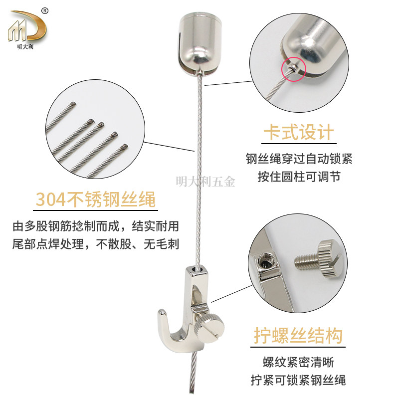 灯饰吊绳伸缩大挂钩可调节304不锈钢丝挂绳钢丝吊码 锁线器挂画器