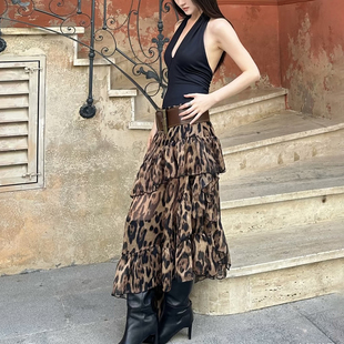 垂坠设计长裙 低腰时尚 怪诞女孩 摩登复古豹纹荷叶边网纱半身裙女
