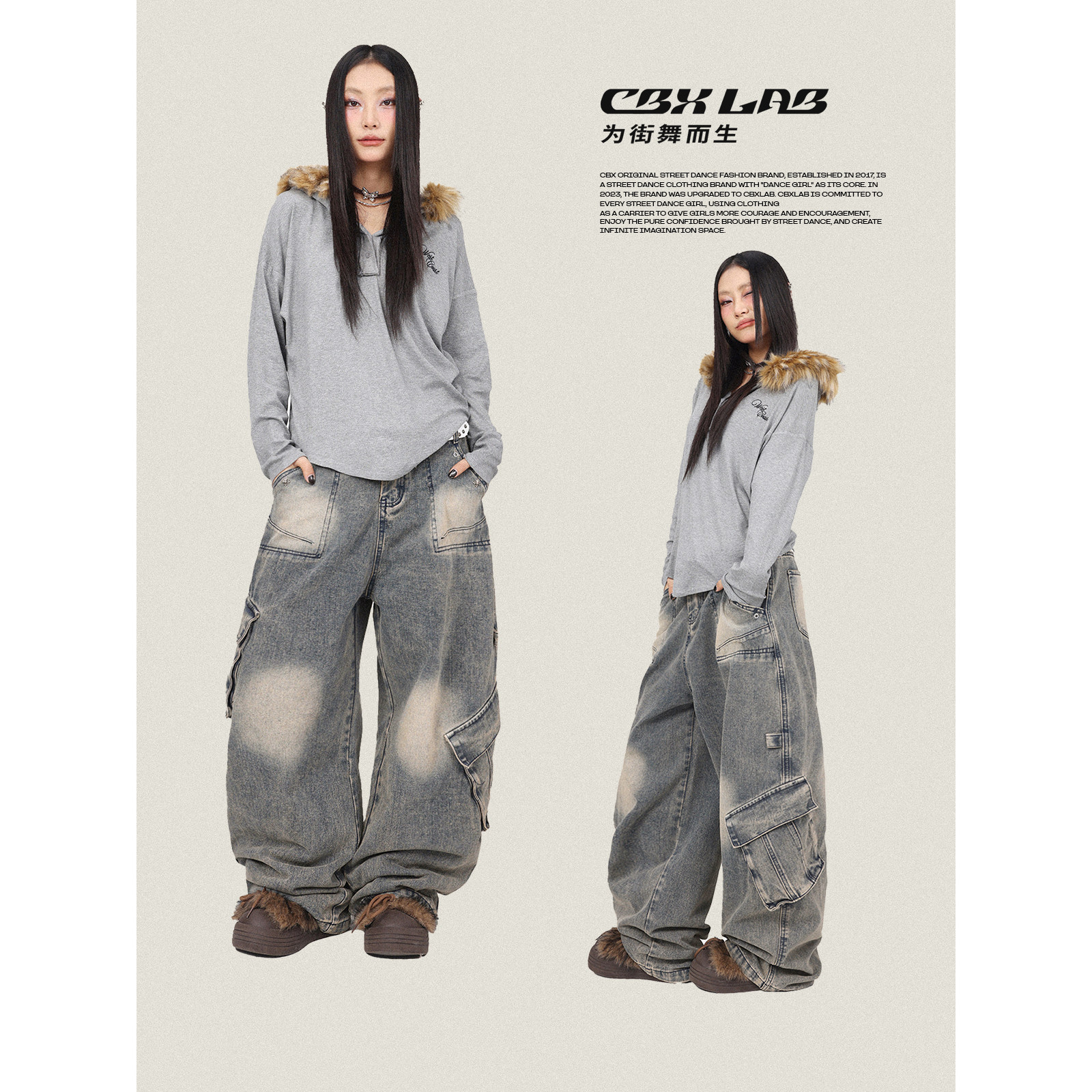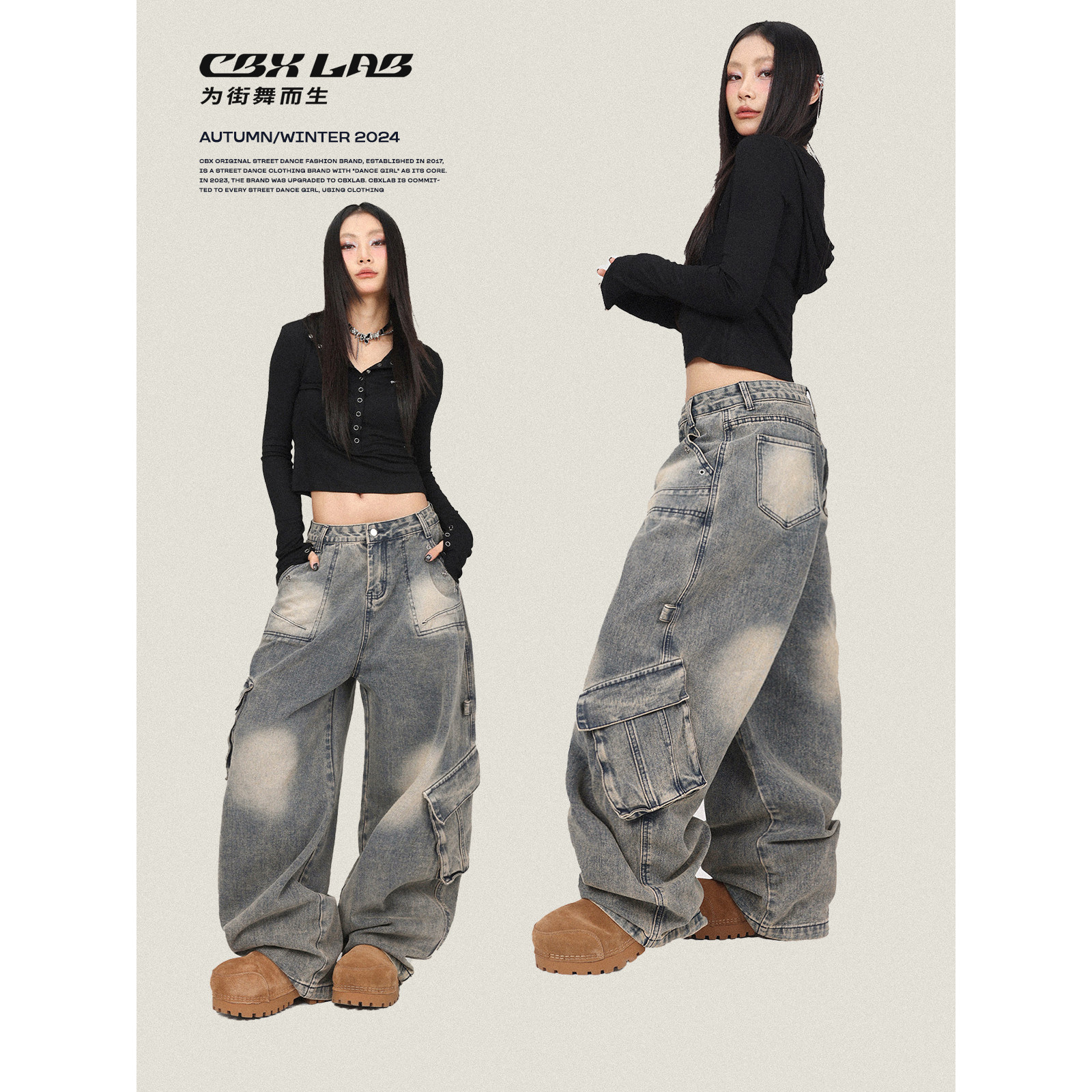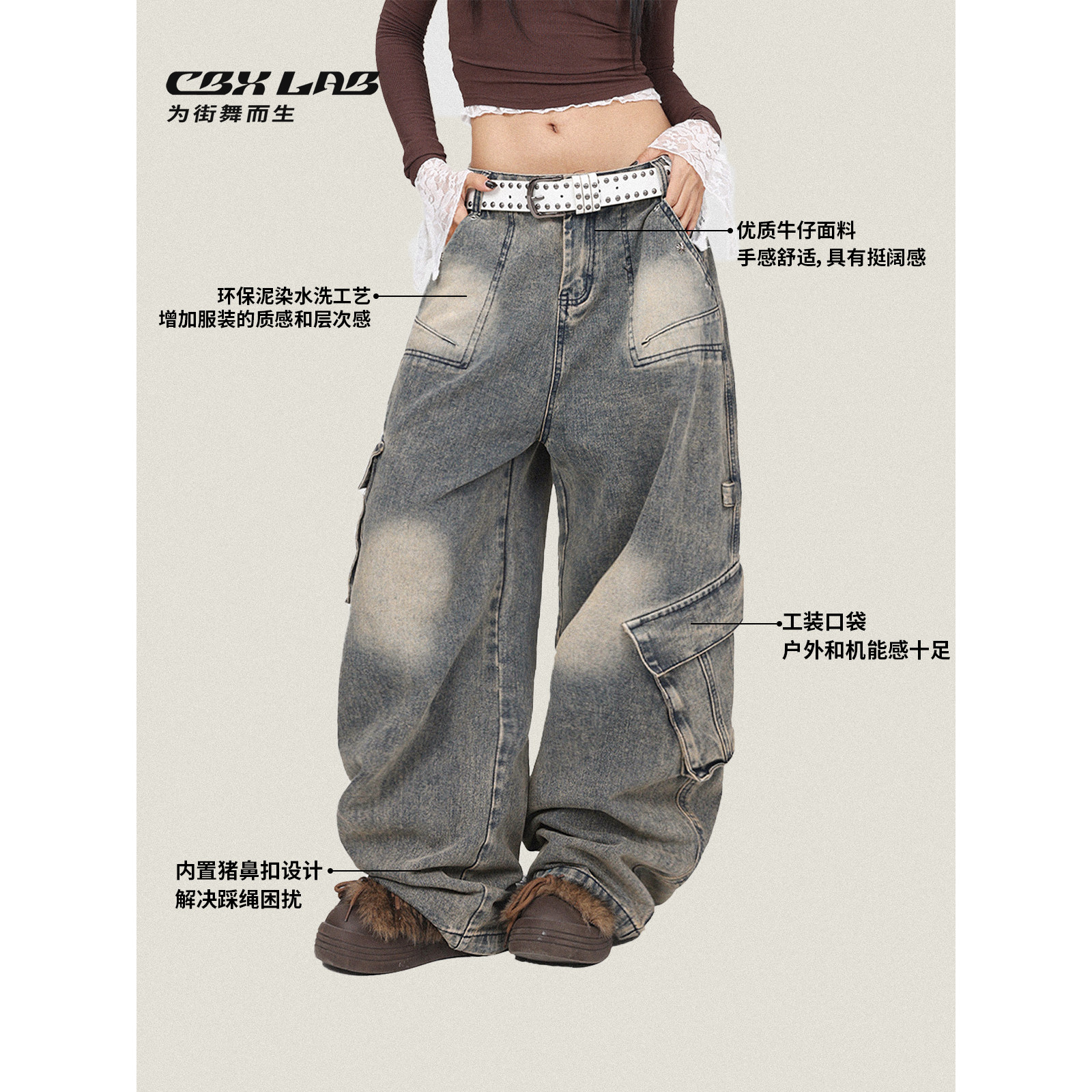 爵士长裤 裤 潮 复古街头辣妹工装 CBXLAB街舞潮牌嘻哈重工水洗牛仔裤