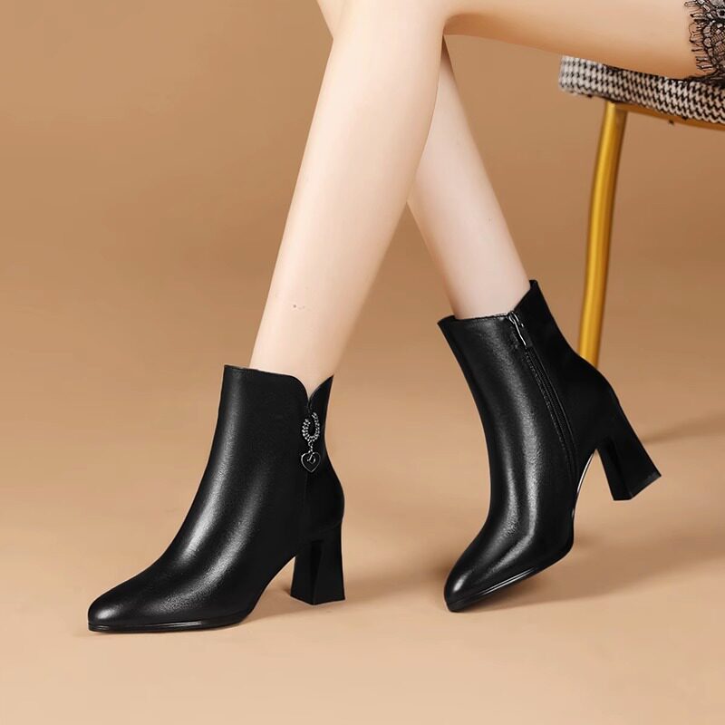 软底百搭时尚 时尚 显瘦靴 真皮高跟短靴子女粗跟2025秋冬新款 品牌鞋