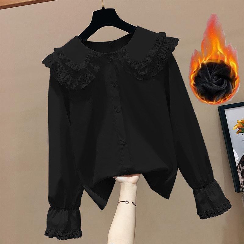 加绒加厚小清新蕾丝娃娃领衬衣 女简约韩版 新款 秋冬打底白衬衫