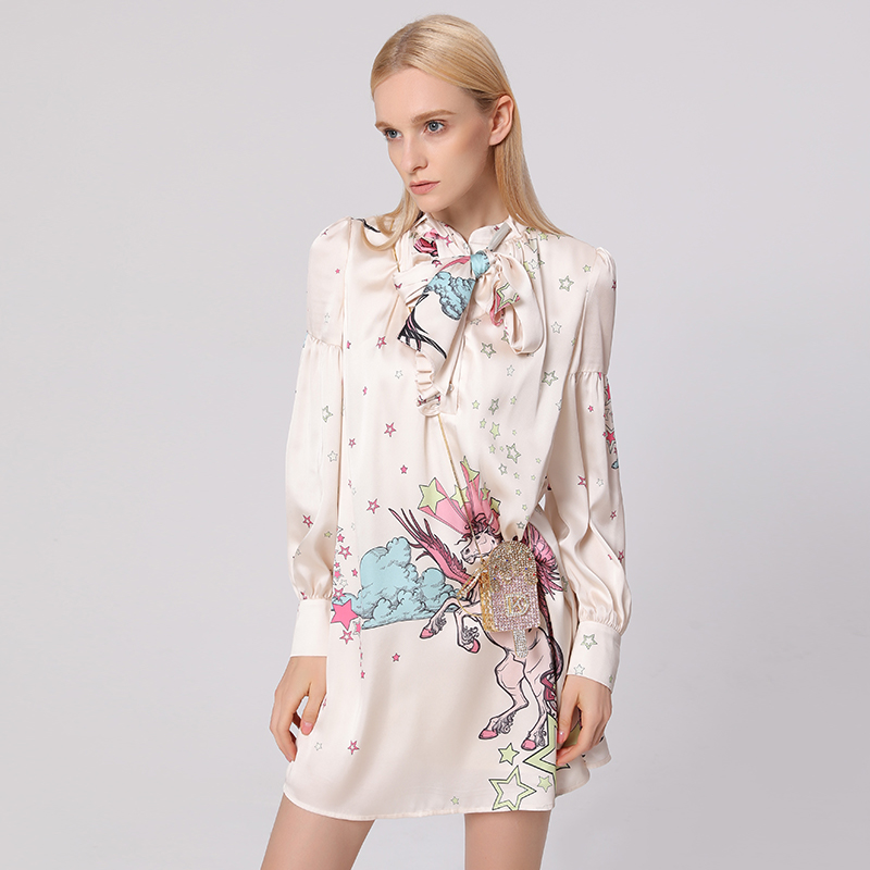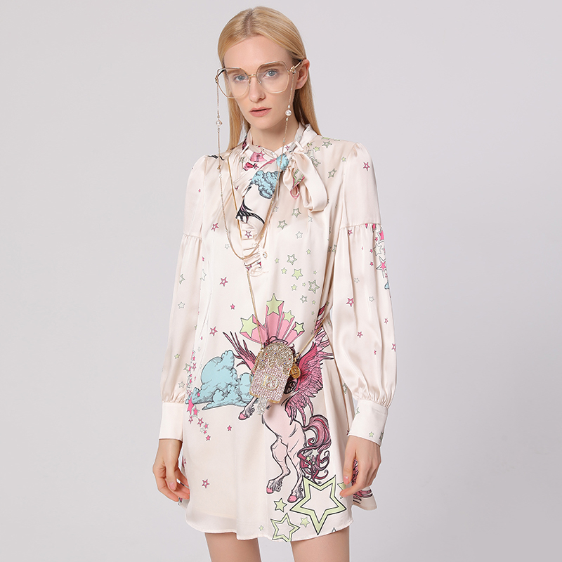 连衣裙短裙子时尚 kodice女装 印花立领木耳边领巾系带长袖 新款 夏季
