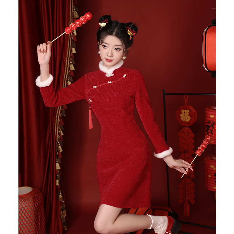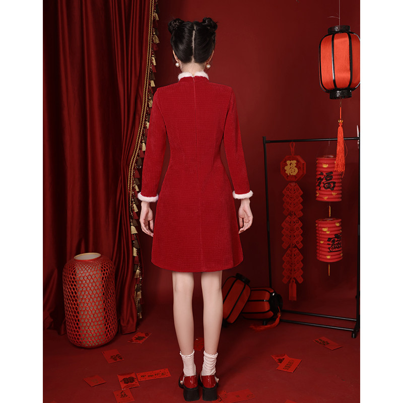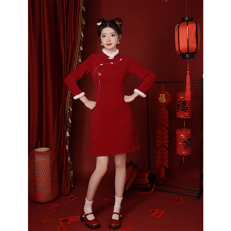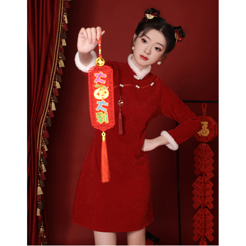 长袖 2025冬装 加绒加厚新年战袍拜年服 旗袍敬酒服回门装 红色新中式
