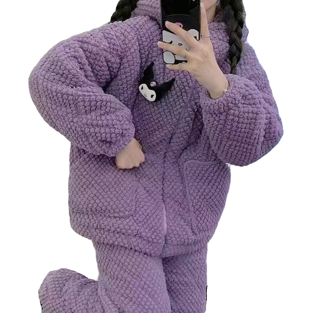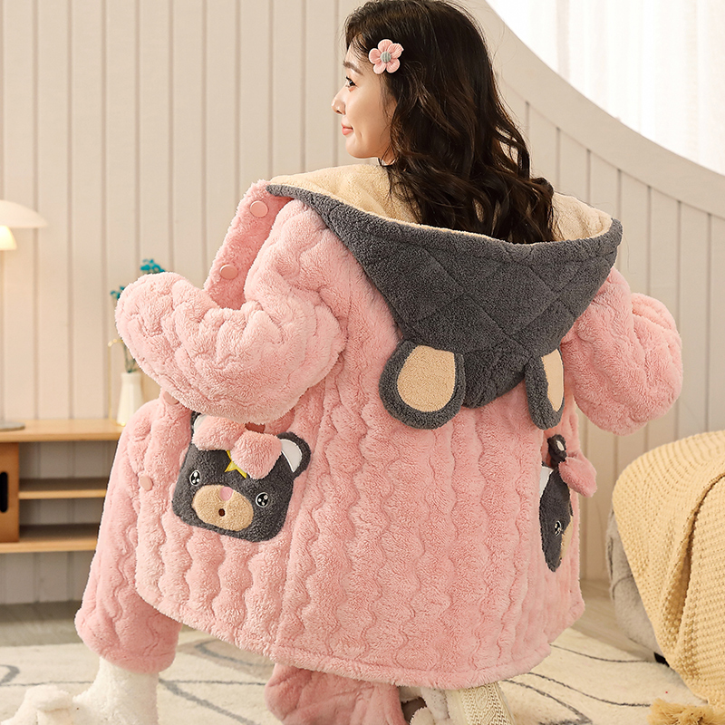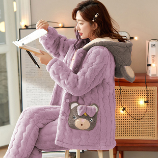家居服套装 珊瑚绒睡衣女秋冬季 加厚加绒三层保暖夹棉袄法兰绒大码