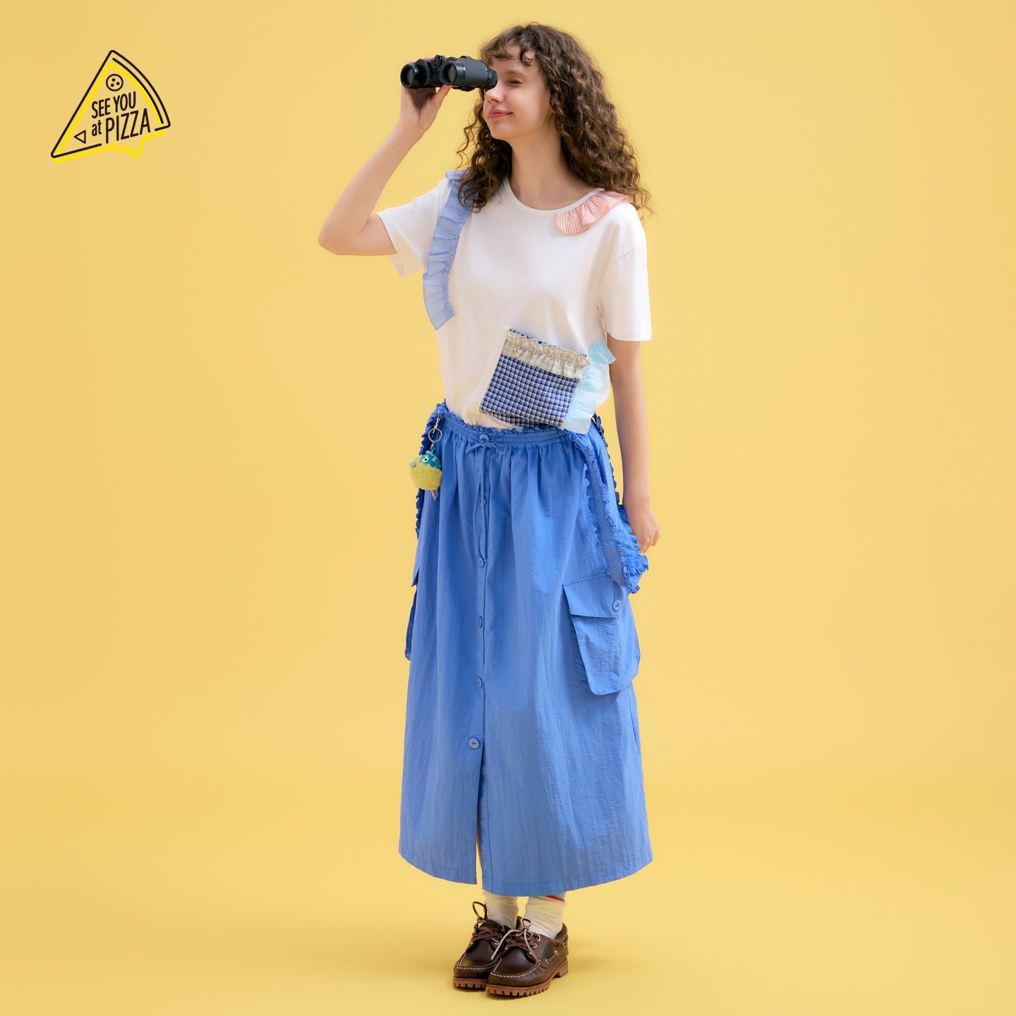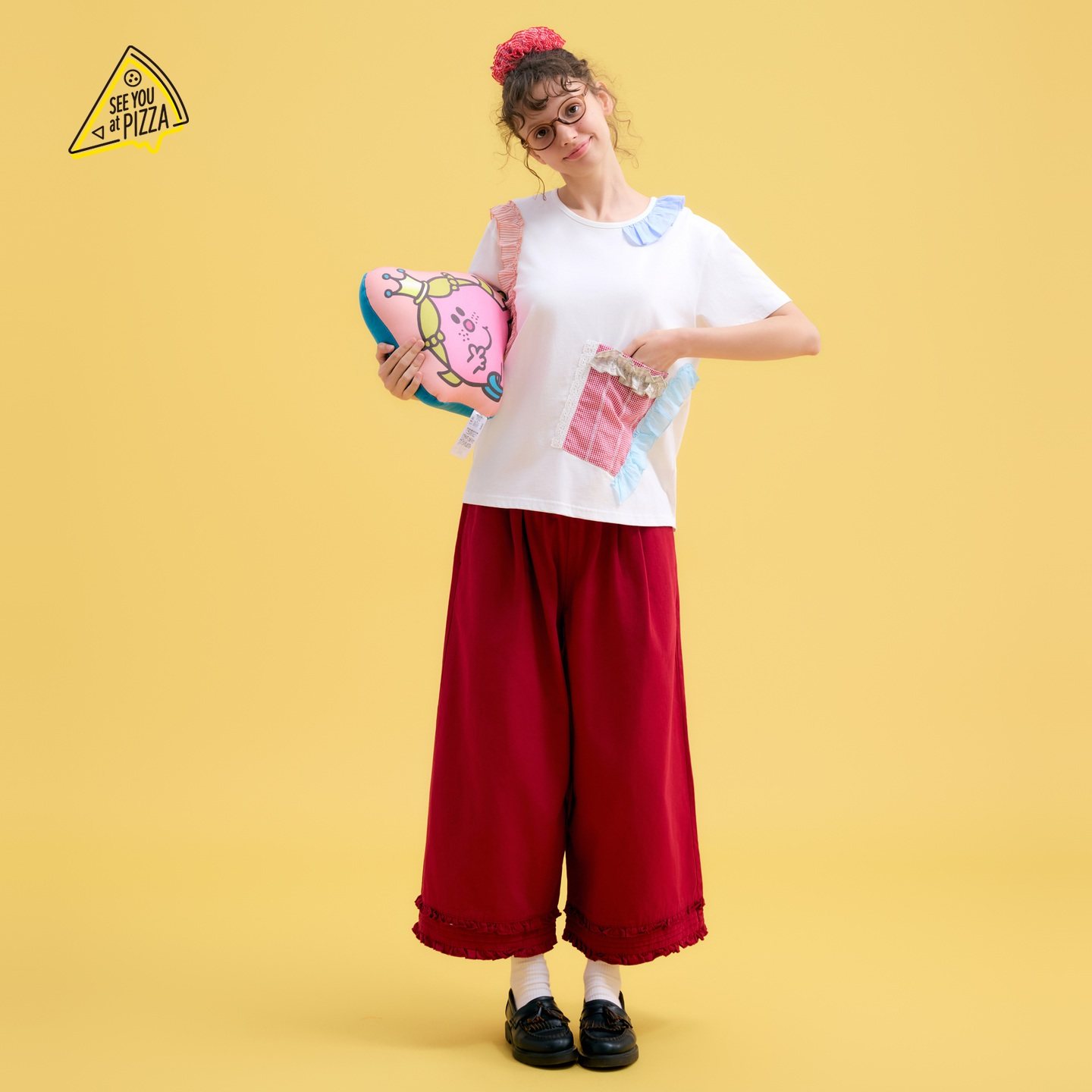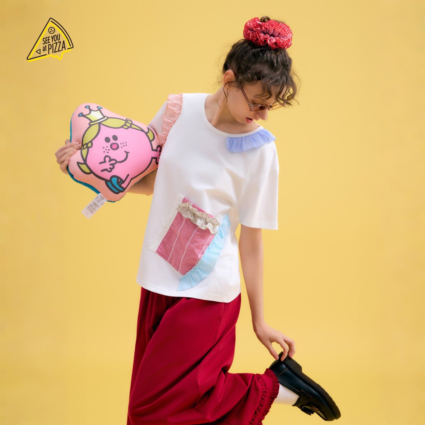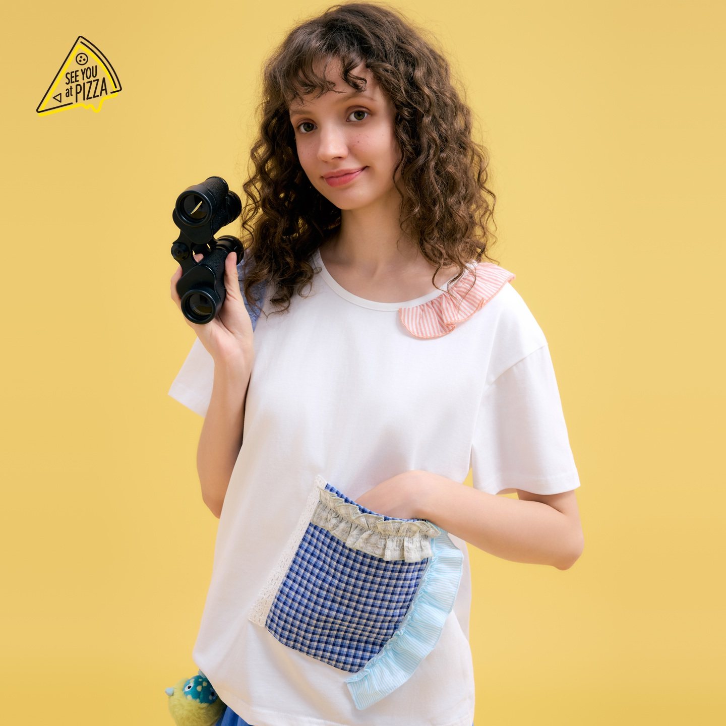 PIZZA T恤女2025夏季 新款 586944 SEE 蕾丝格纹拼接短袖 YOU