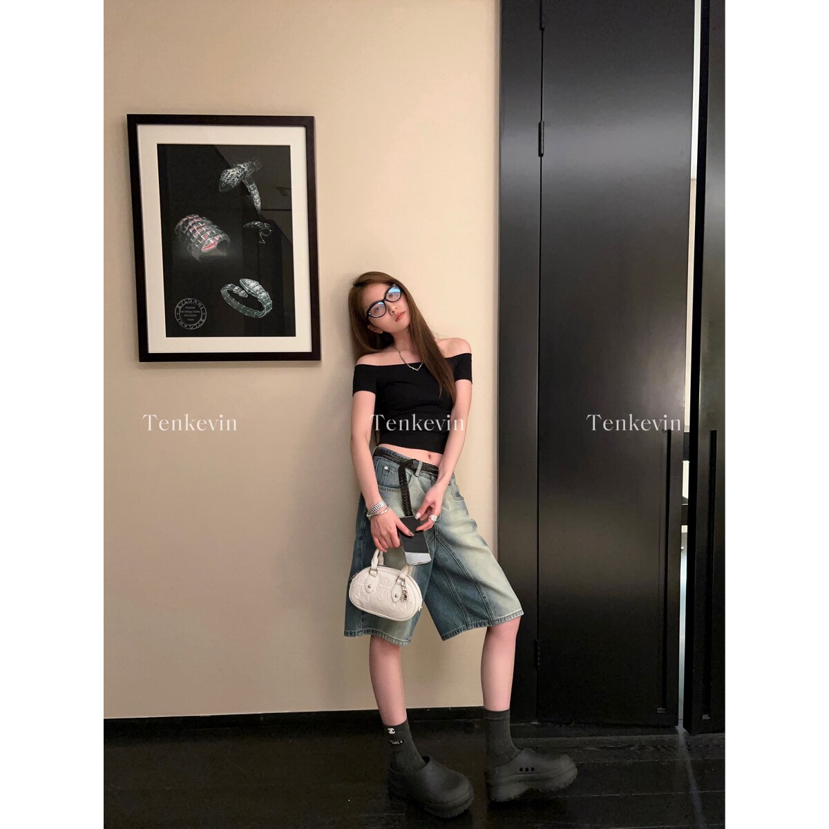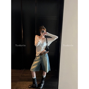 中裤 女夏宽松阔腿五分裤 高街痞酷廓形复古直筒牛仔短裤 十一石