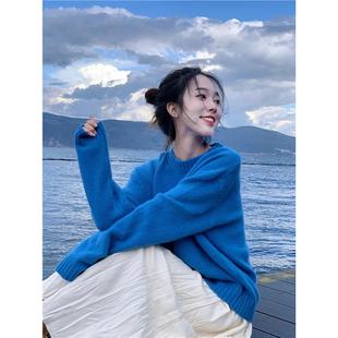 2025秋冬新款 圆领上衣外穿 克莱因蓝色套头毛衣女秋冬宽松针织衫
