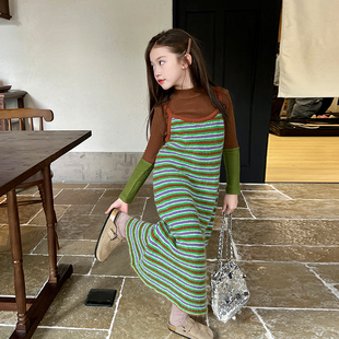 栀了成长记童装 女童时髦条纹吊带裙秋冬2025儿童裙子针织连衣裙