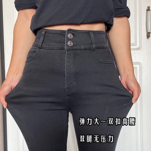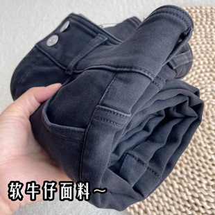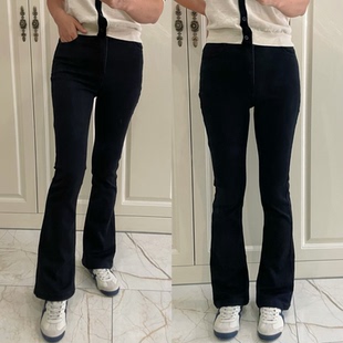 弹力显瘦显腿长女秋冬 马蹄裤 欧美双扣高腰加绒黑色微喇叭裤 牛仔裤