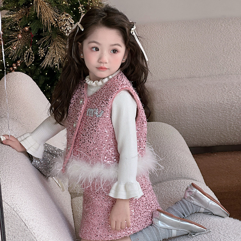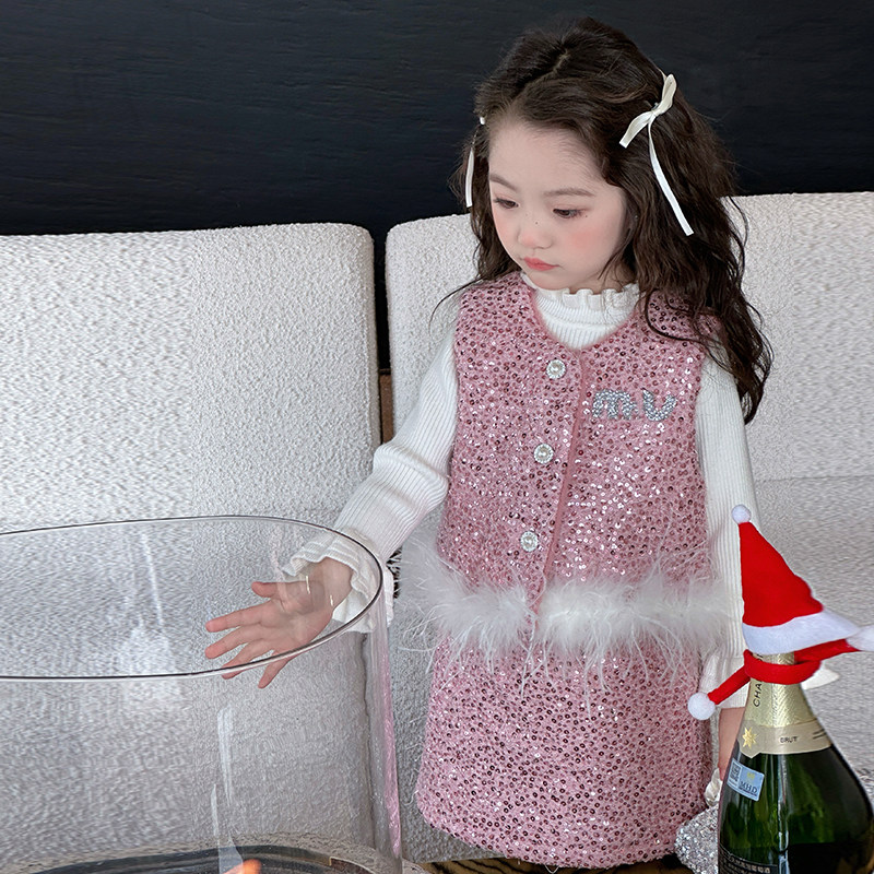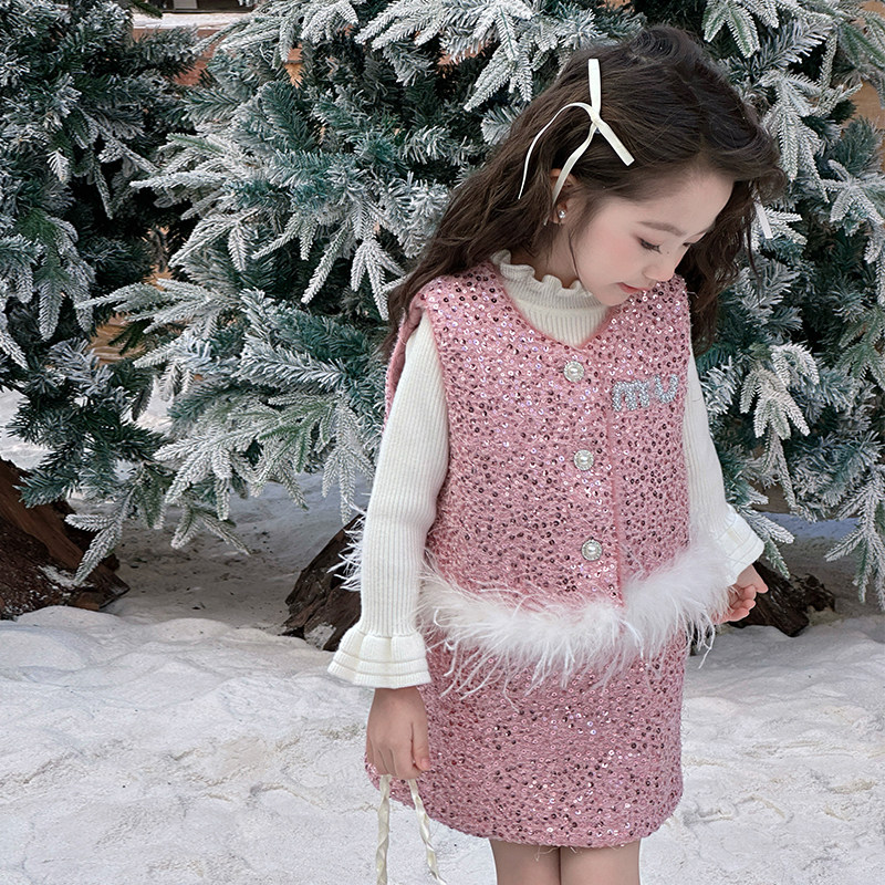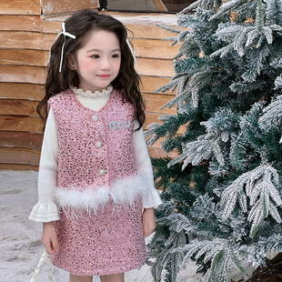 洋气女宝宝亮片小香风套裙公主过年衣服 冬装 女童新年套装 2025新款