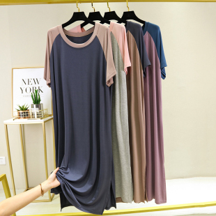 a字裙长裙过膝家居裙 连衣裙大码 莫代尔睡裙女夏拼接薄款 宽松短袖