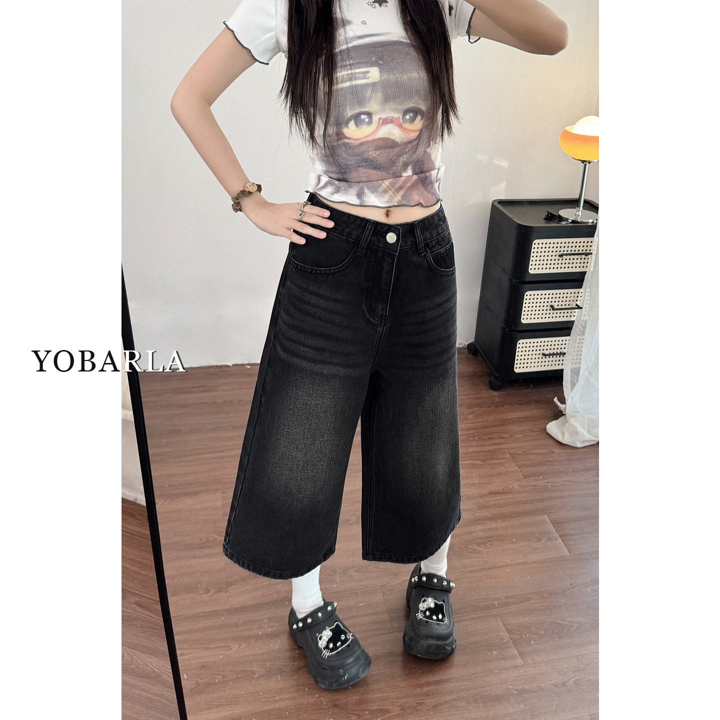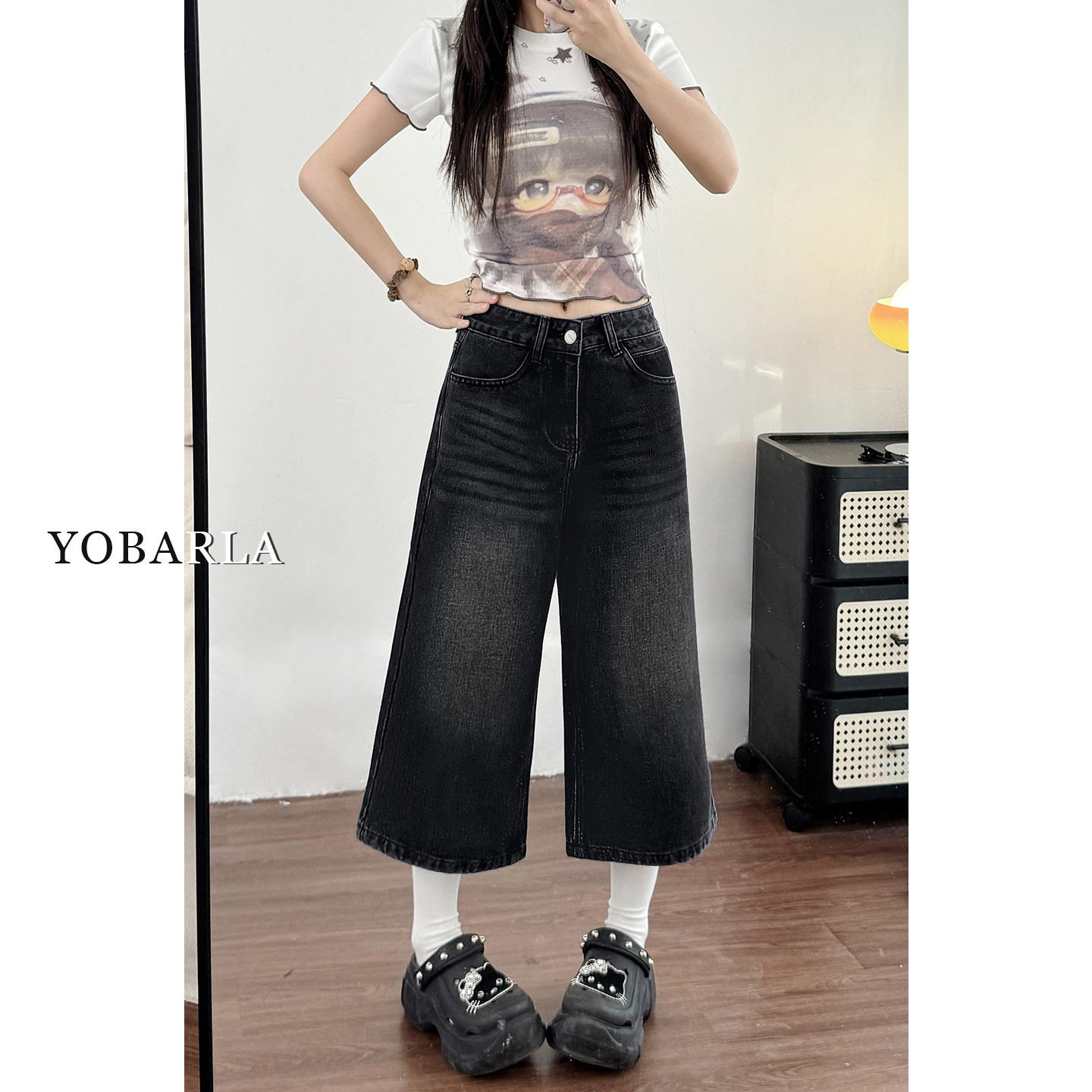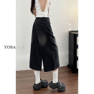 胖mm梨型身材显瘦宽松阔腿裤 黑色直筒牛仔七分裤 大码 新款 子 女夏季