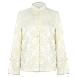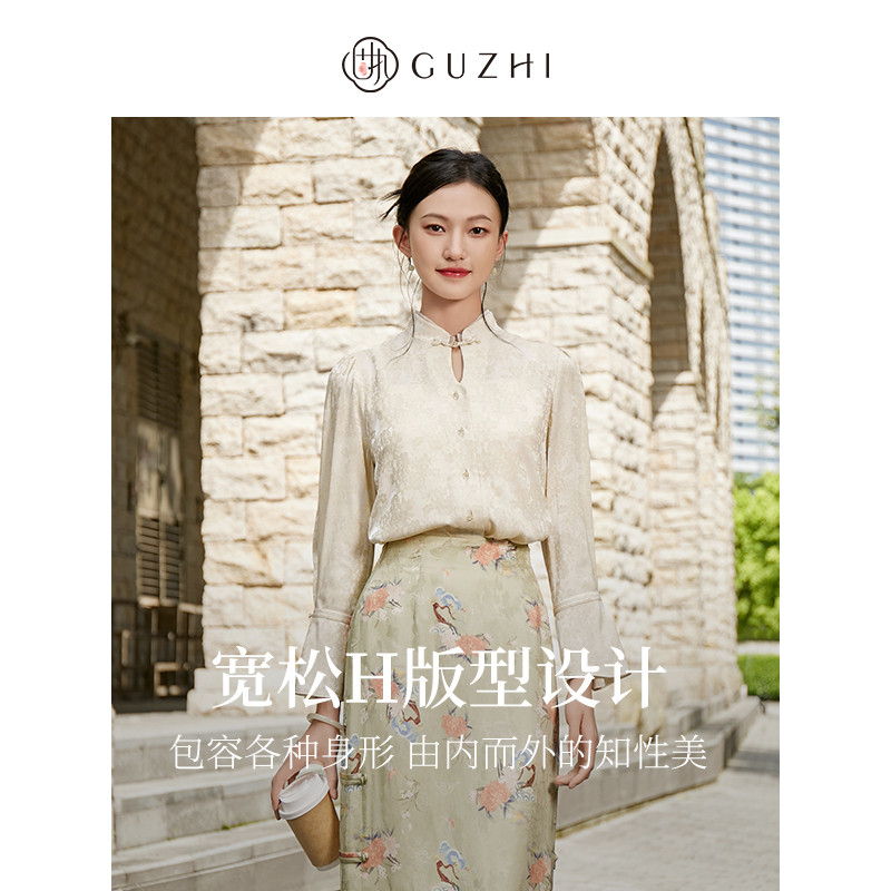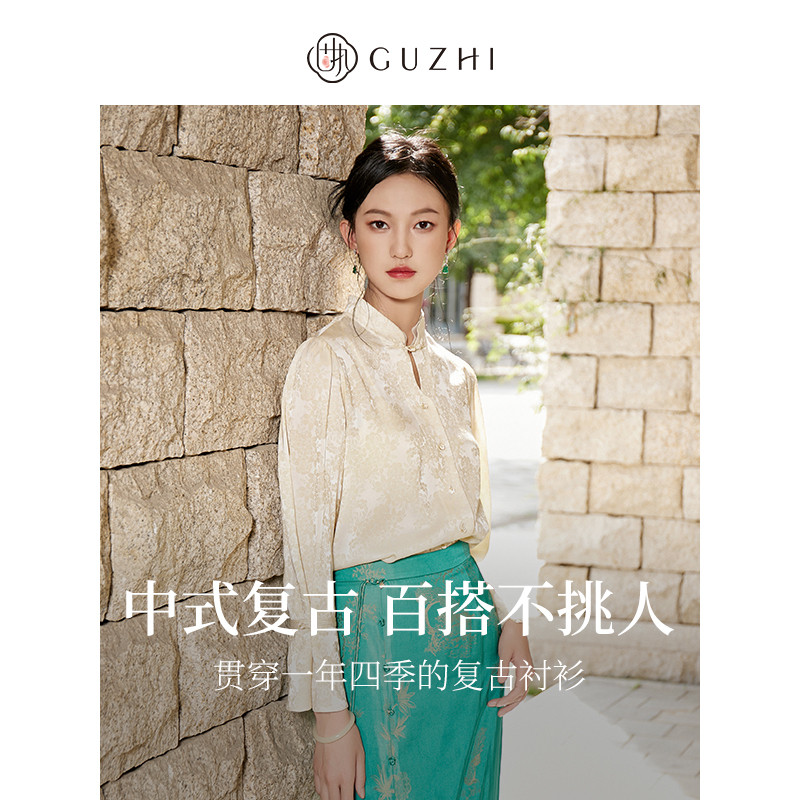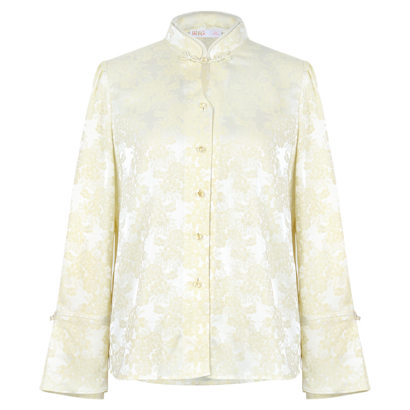 新款 衬衫 中式 薄款 上衣女 复古纯色立领提花泡泡长袖 固执秋季